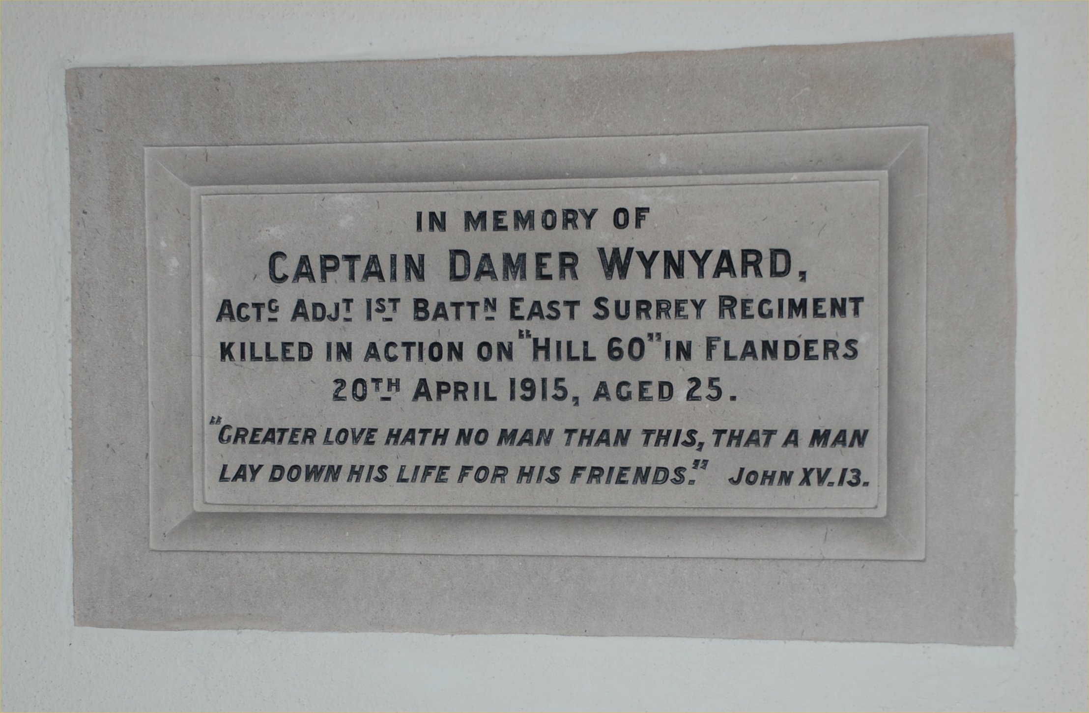 In memory of Captain Damer Wynyard Actg. Adjt. 1st Battn. East Surrey Regiment killed in action on "Hill 60" in flanders 20th April 1915, aged 25. "Greater love hath no man than this, that a man lay down his life for his friends." John XV.13.
