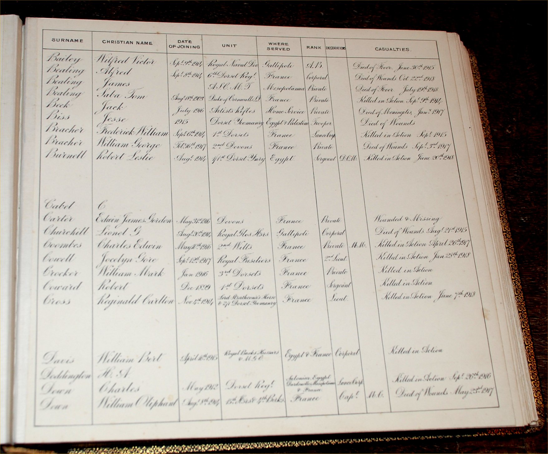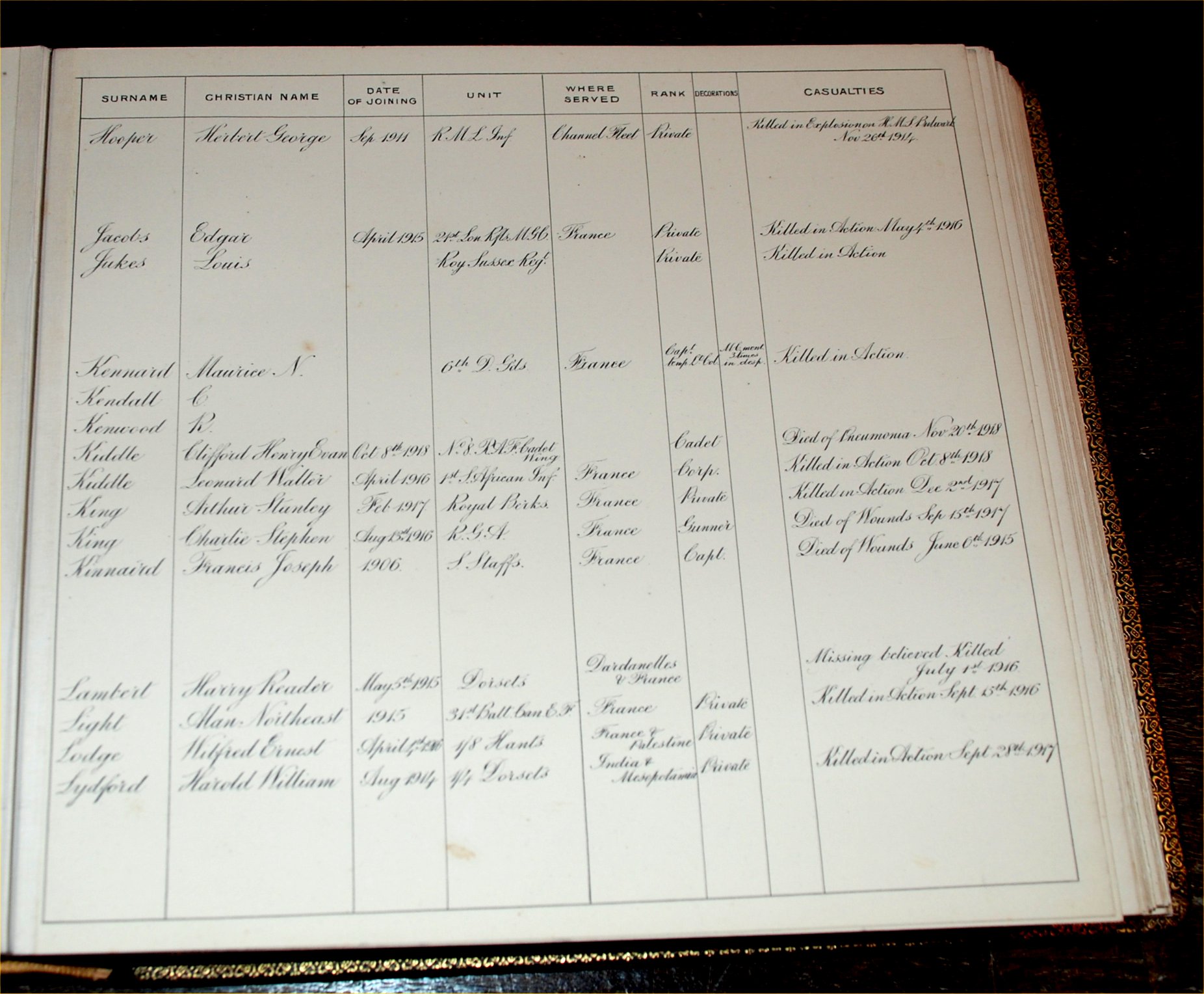 In Grateful Remembrance This Album is dedicated to the memory of the men of Gillingham, Dorset, who took part in the Great War 1914-1918 risking lifeand health for their loved ones at home, their King and Country and the peace of the World. Many were denied the joy of seeing the happy result of their sacrifice, many returned peermantly maimed and others were fortunate in sustaining no lasting injury. To provide a permenant record of the names of all those who gave their services in this noble cause, this album has been subscribed for by the inhabitants of Gillingham to be retained with the Parish Archives.