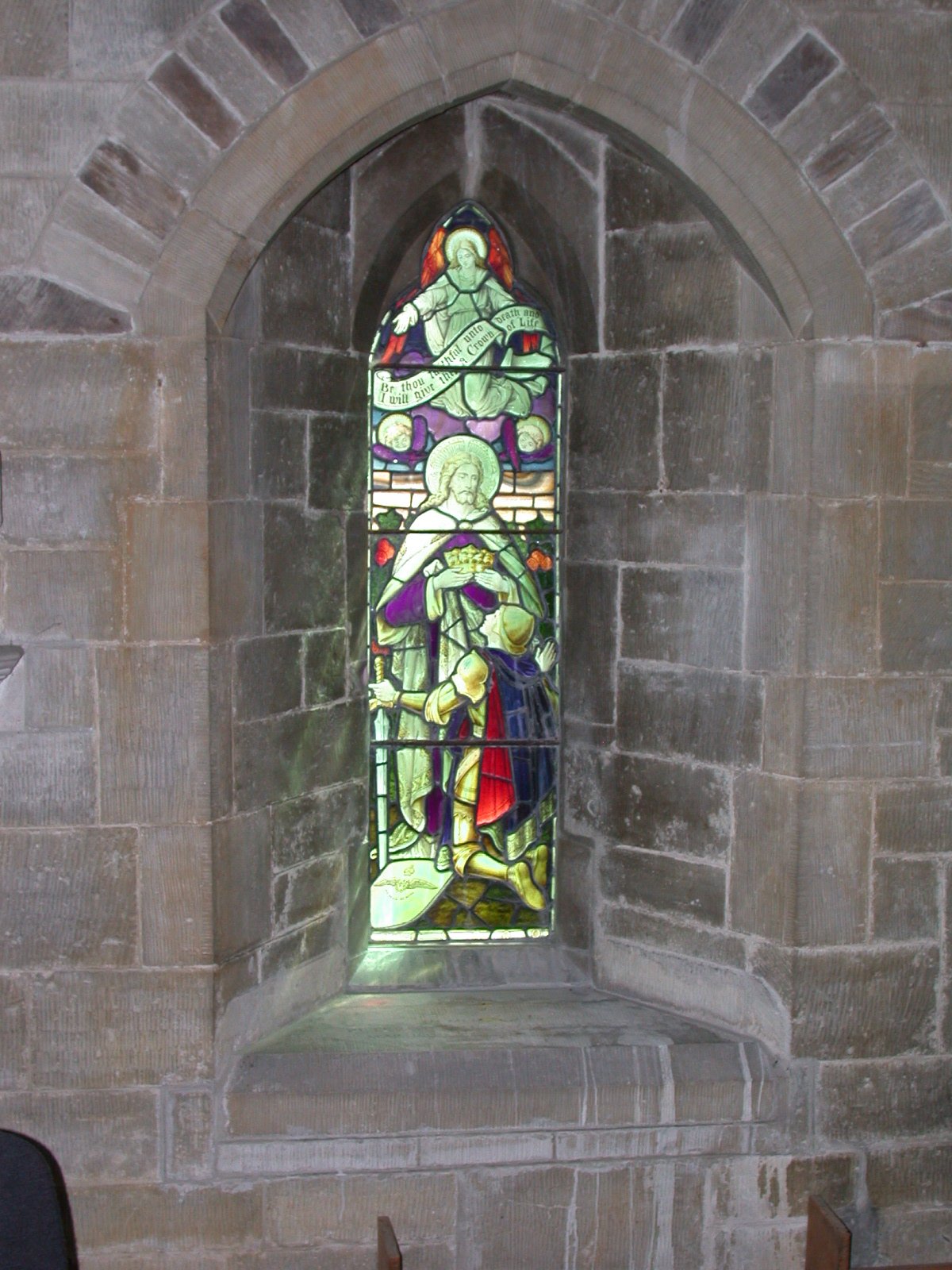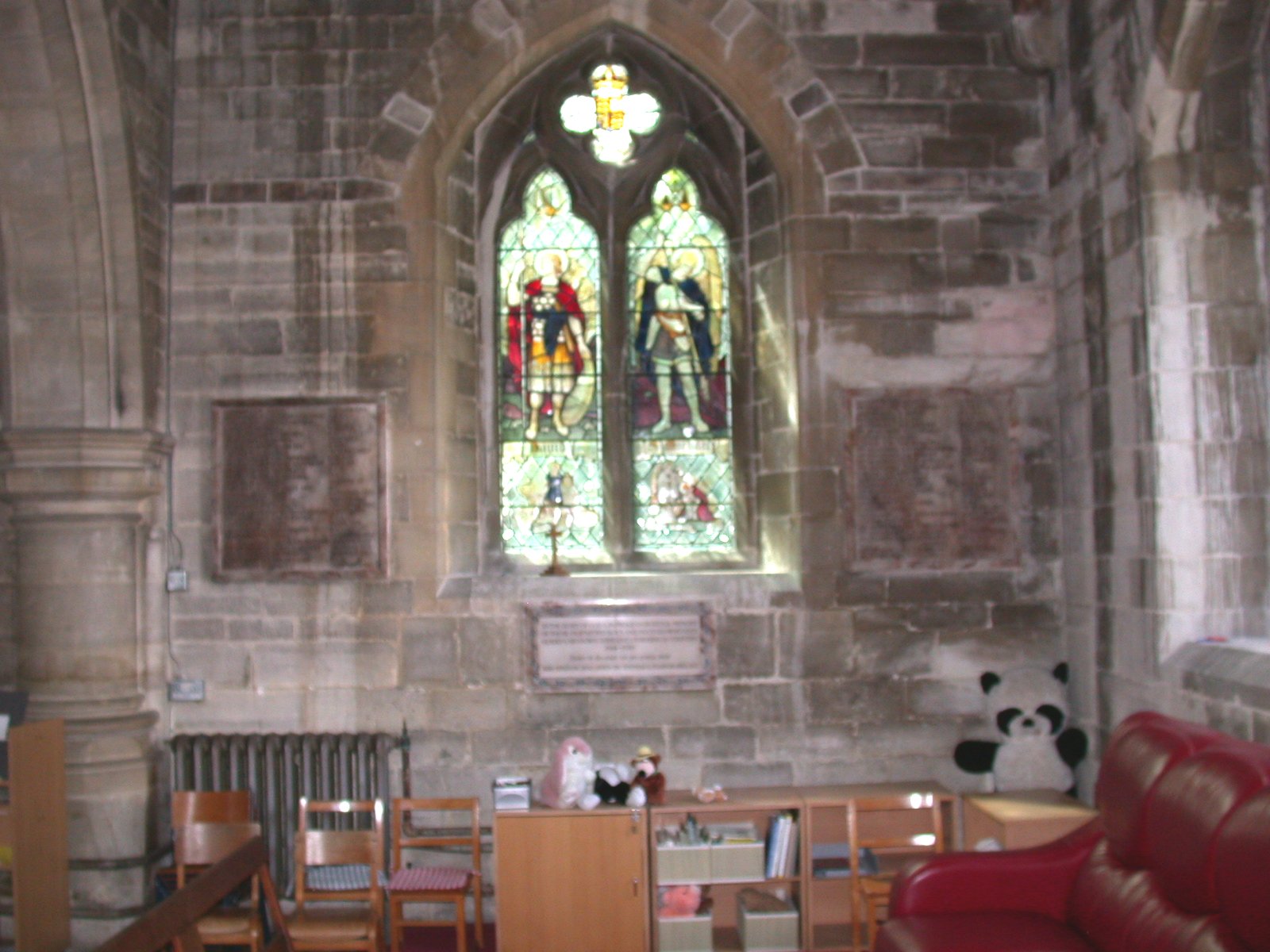Two marble plaques on wall in St George's Church either side of window with small marble plaque under window