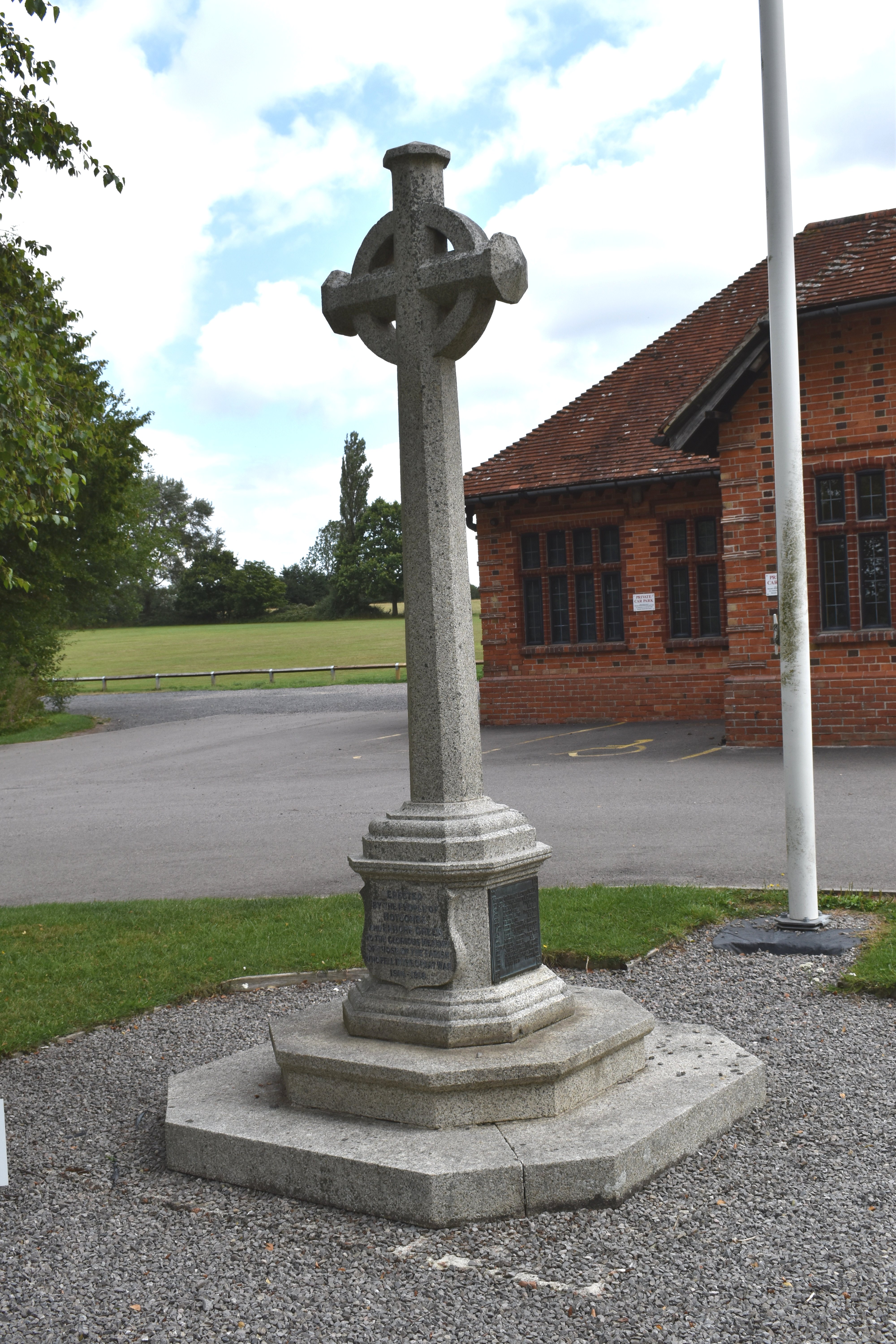 Stone cross just outside village hall, names on bronze panels on faces of plinth.