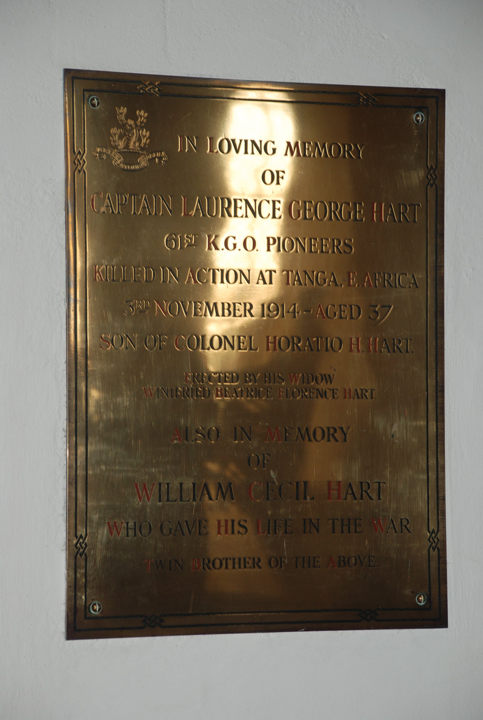 In Loving Memory of Captain Laurence George Hart 61st K.G.O. Pioneeers Killed in Action at Tanga. E.Africa 3rd November 1914-Aged 37 Son of Colonel Horatio H.Hart.