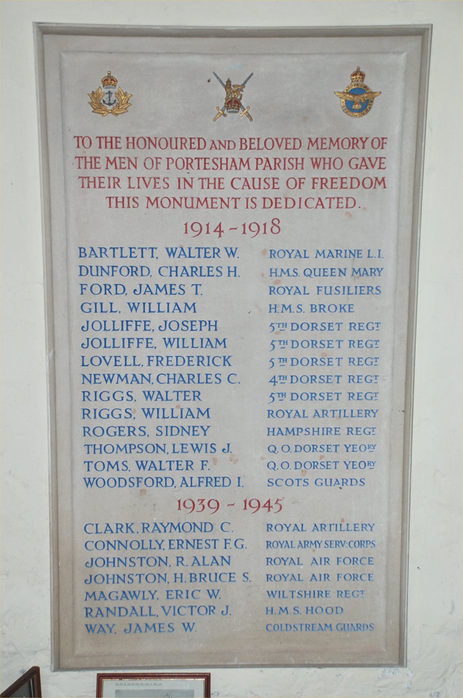 To the honoured and beloved memory of the men of Portesham parish who gave their lives in the cause of freedom this monument is dedicated. 1914 - 1918