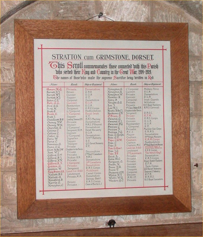 Stratton cum Grimstone, Dorset. This Scroll commemorates those connected with this Parish who served their King and Country in the Great War 1914-1919, The names of those who made the supreme Sacrifice being written in Red.