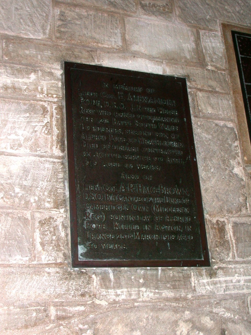 Im memory of Lieut. Col. E. Alexander Pope, D.S.O. J.P. The Welsh Regt. who raised & commanded the 12th Battn. South Wales Borderers, second son of Alfred Pope of Wrackleford. Died of disease contracted on active service 9th April 1919 Aged 43 years Also of Lieut. Col. A.R.Haig-Brown D.S.O. B.A. Cantab of the Duke of Cambridges Own (Middlesex Regt.) son-in-law of Alfred Pope. Killed in action in France 25th March 1918 aged 40 years.
