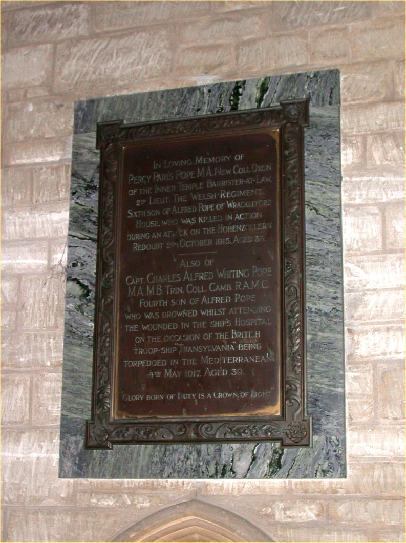 In loving memory of Percy Paris Pope MA.New Coll Oxon of the Inner Temple Barrister-at-Law, 2nd Lieut. The Welsh Regiment sixth son of alfred Pope of Wrackleford House, who was killed in action during an attack on the Hohenzollern Redoubt 2nd October 1915. Aged 33. Also of Capt. Charles Alfred Whiting Pope MA. MB. Trin. Coll. Camb. R.A.M.C. Fourth son of Alfred Pope who was drowned whilst attendint the wounded in the ship's hospital on the occasion of the British troop-ship "Transylvania" being torpedoed in the Mediterranean 4th May 1917. Aged 39. "Glory born of Duty is a Crown of Light"