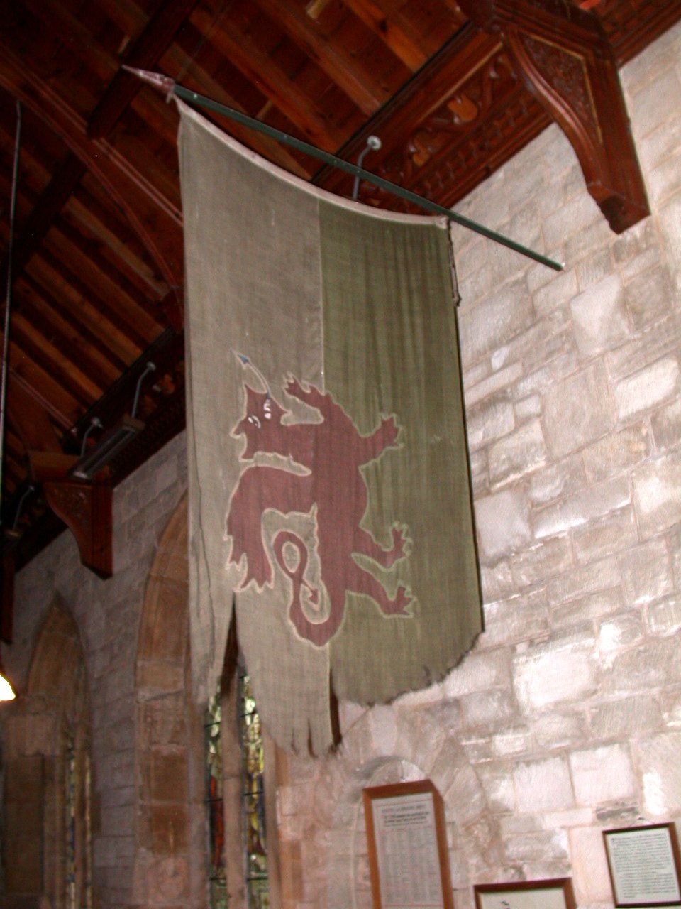 Flag hanging in St Mary's Church near Roll of Honour with a framed typed explanation on the wall.