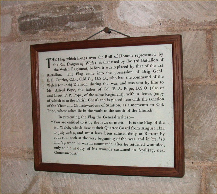 The Flag which hangs over the Roll of Honour represented by the Red Dragon of Wales-is that used by the 3rd Battalion of the Welch Regiment, before it was replaced by that of the 1st Battalion. The Flag came into the posession of Brig.-Genl. F.P. Crozier, C.M.G., D.S.O., who had the command of the Welch (or 40th) Division during the war, and was sent by him to Mr. Alfred Pope, the father of Col. E.A. Pope, D.S.O. (also of 2nd Lieut. P.P. Pope, of the same Regiment), with a letter, (copy of which is in the Parish Chest) and is placed here with the sanction of the Vicar and Churchwardens of Stratton, as a momento to Col. Pope, whose ashes lie in the vault to the south of the Church. In presenting the Flag the General writes:- "You are entitles to it by the laws of merit. It is the flag of the 3rd Welch, which flew at their Quarter Guard from August 4/14 to July 20/19, and must have been Saluted daily at Retreat by your son, both at the very beginning of the war, and in '17, '18 and '19 when he was in command: after he returned wounded, only to die at duty of his wounds sustained in April/17, near Gouzeaucourt."