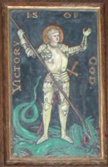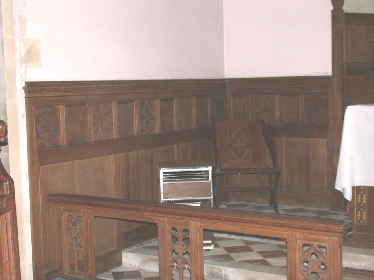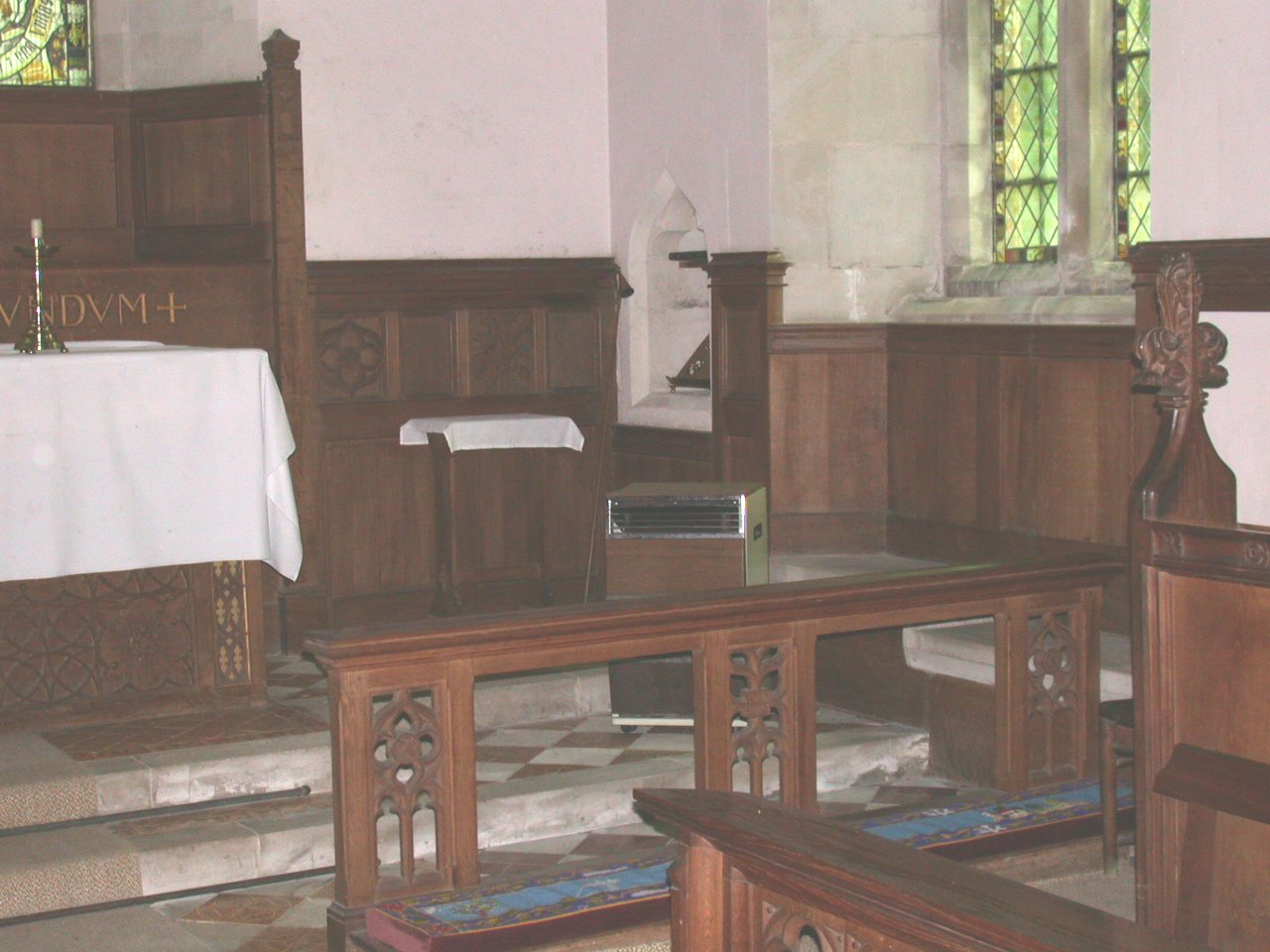 Wooden panelling around altar, inscription on panel under window on right of altar.