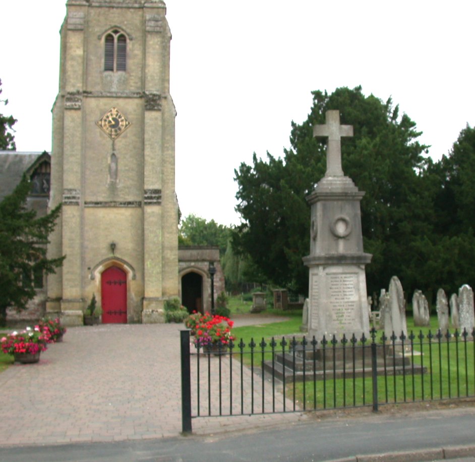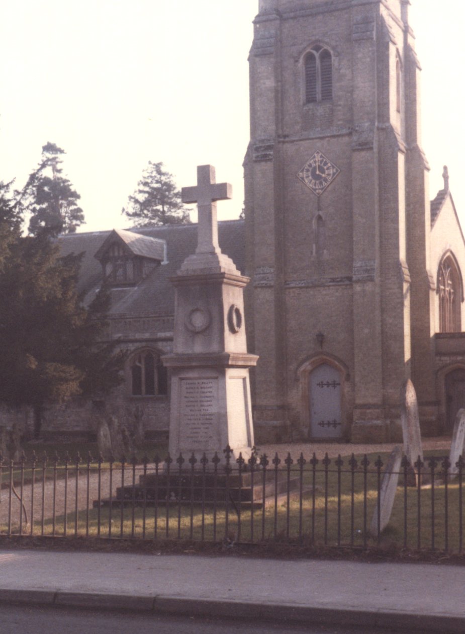 Stone cross outside All Saints Parish Church in churchyard, panels with inscriptions around plinth.