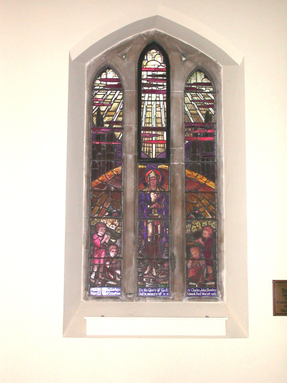 Window next to plaque, inscriptions at bottom of each panel.