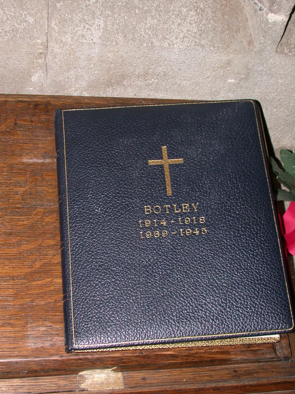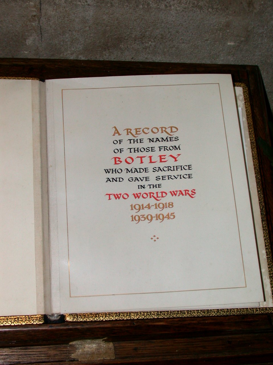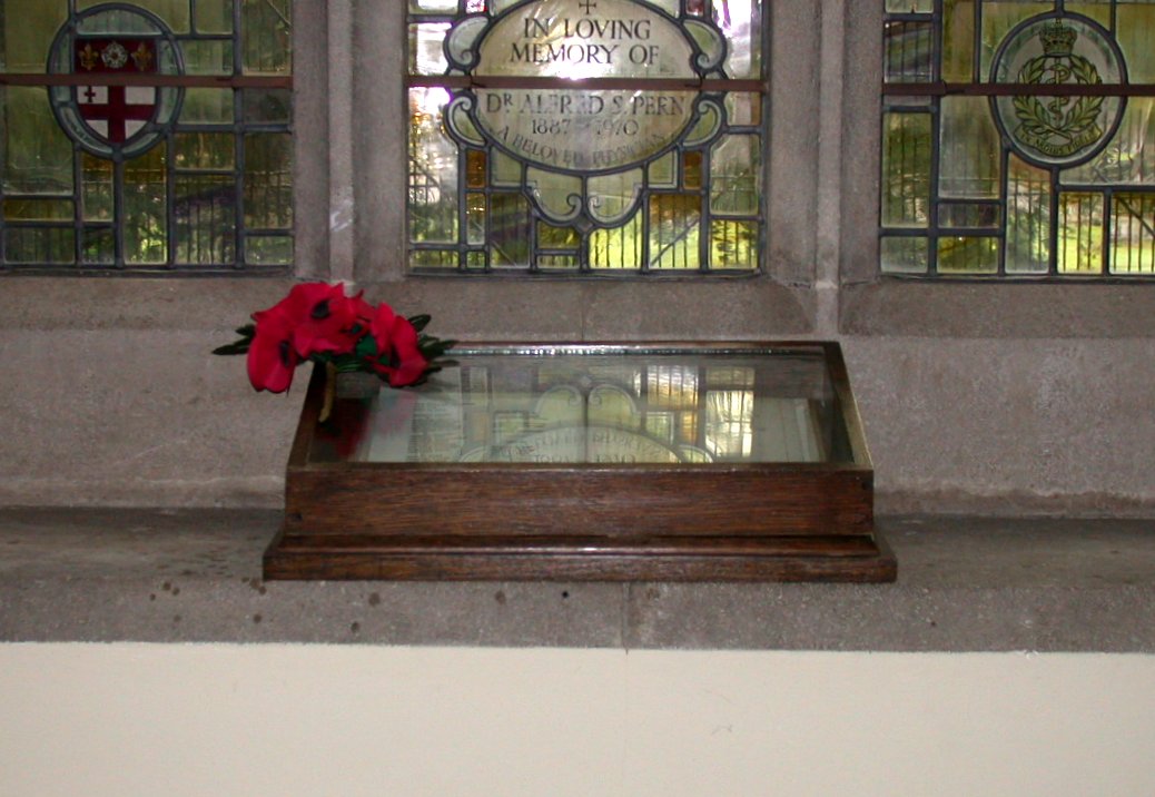 Roll of Honour book in wooden case, glass front, on windowsill in All Saints Church.