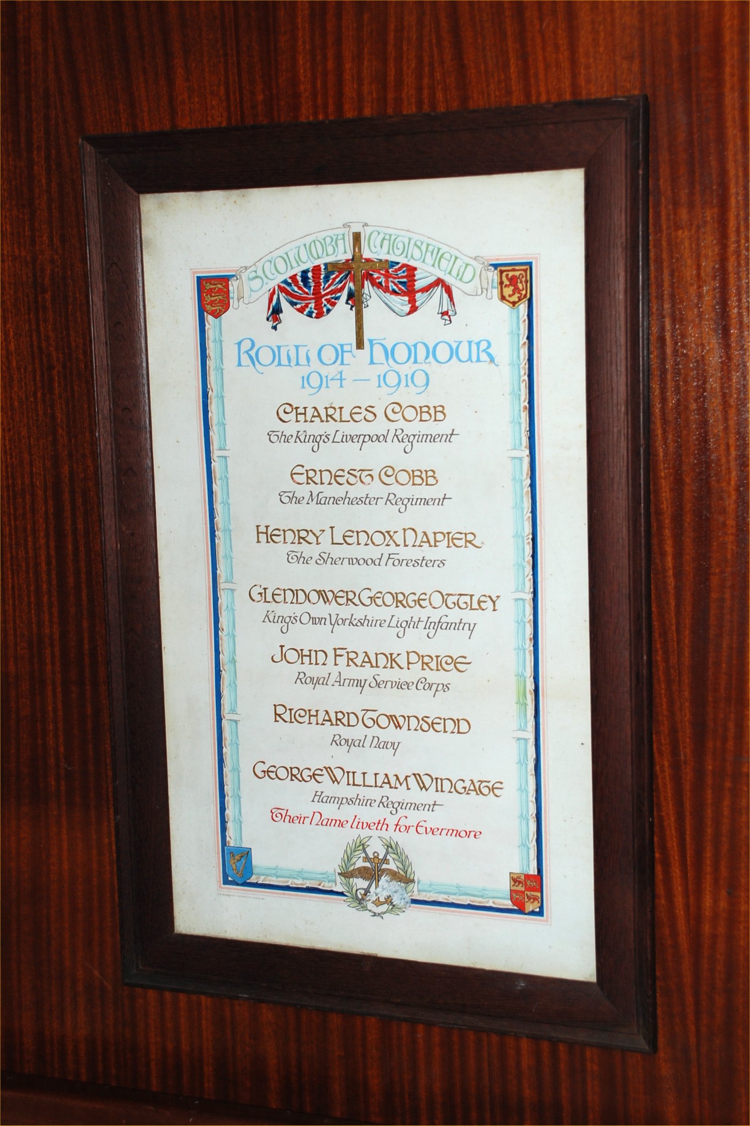 Framed hand written scroll in St Columba Church, originally in the old St Columba Tin Tabernacle church