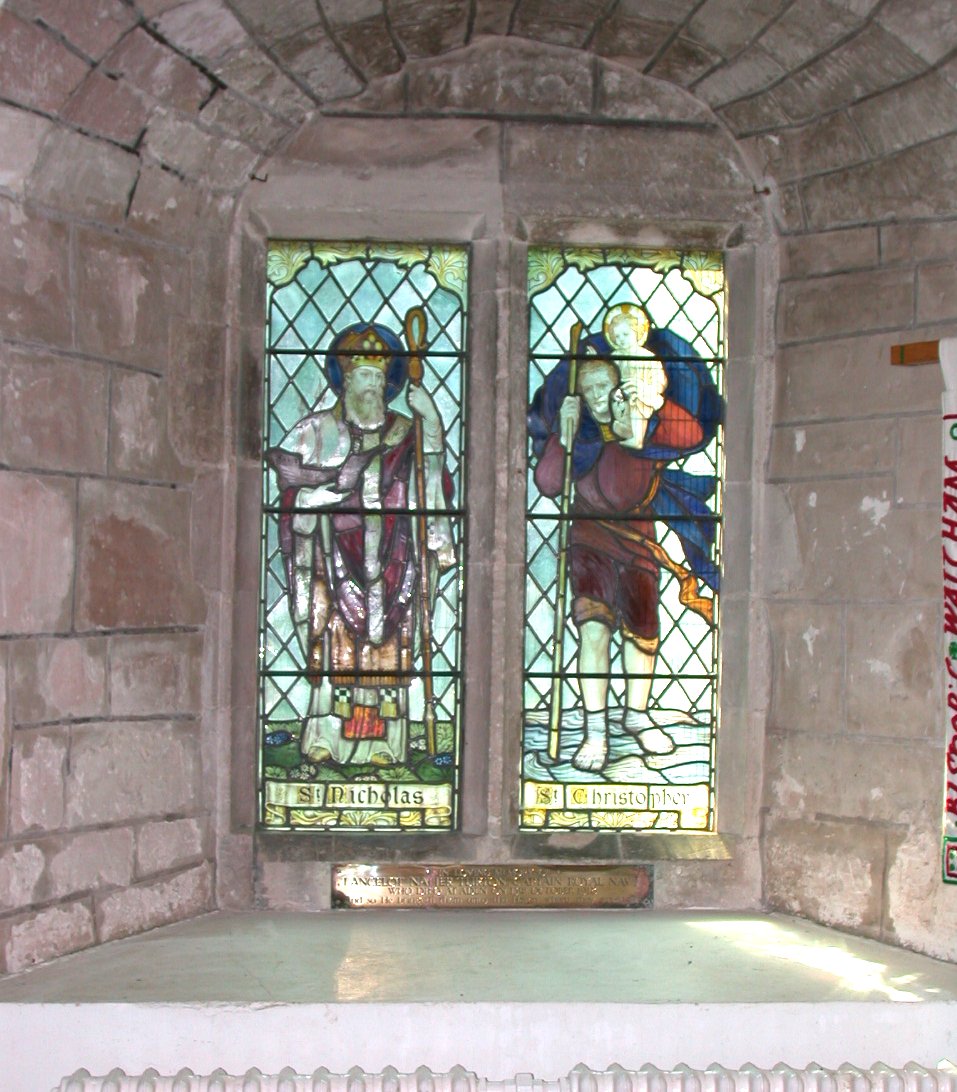 Brass plaque with wooden backing on wall in St Mary and All Saints Church.