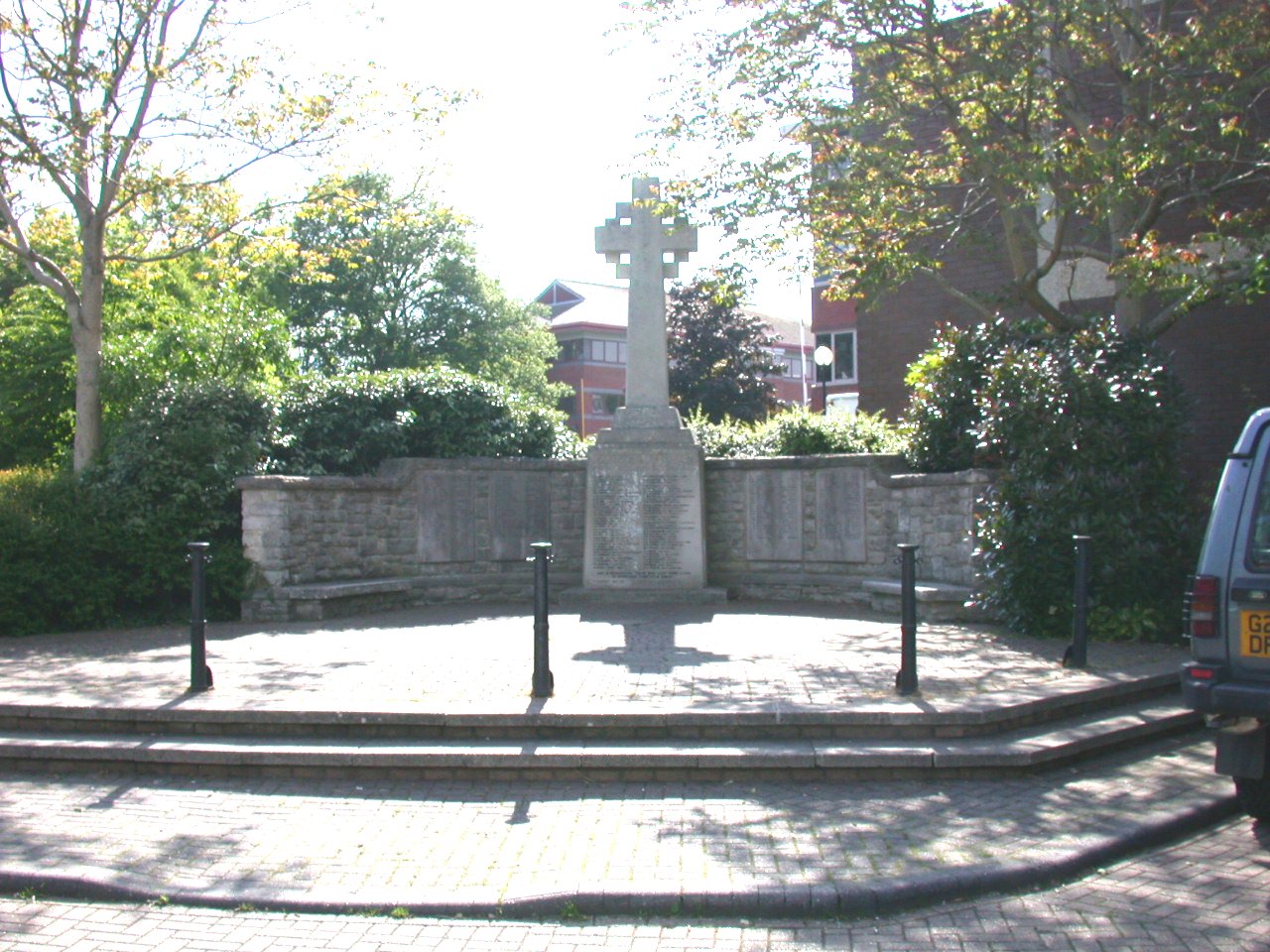 Stone cross in centre of wall which has two plaques each side. Memorial is in a car park in Gurkha Square,