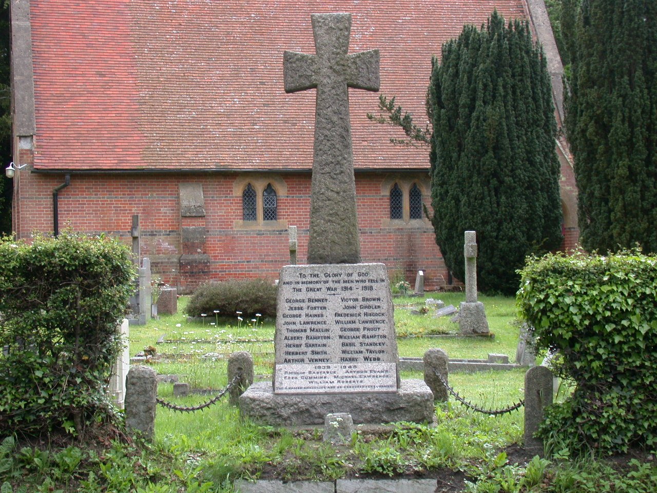 Stone cross near roadside just in St Peter's churchyard, names on front of base plinth.