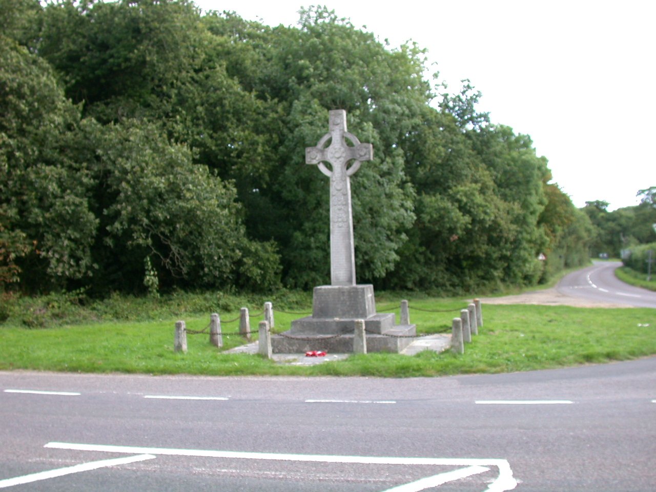 Stone cross on main (A35) road, names on cross upright, other inscription on plinth.