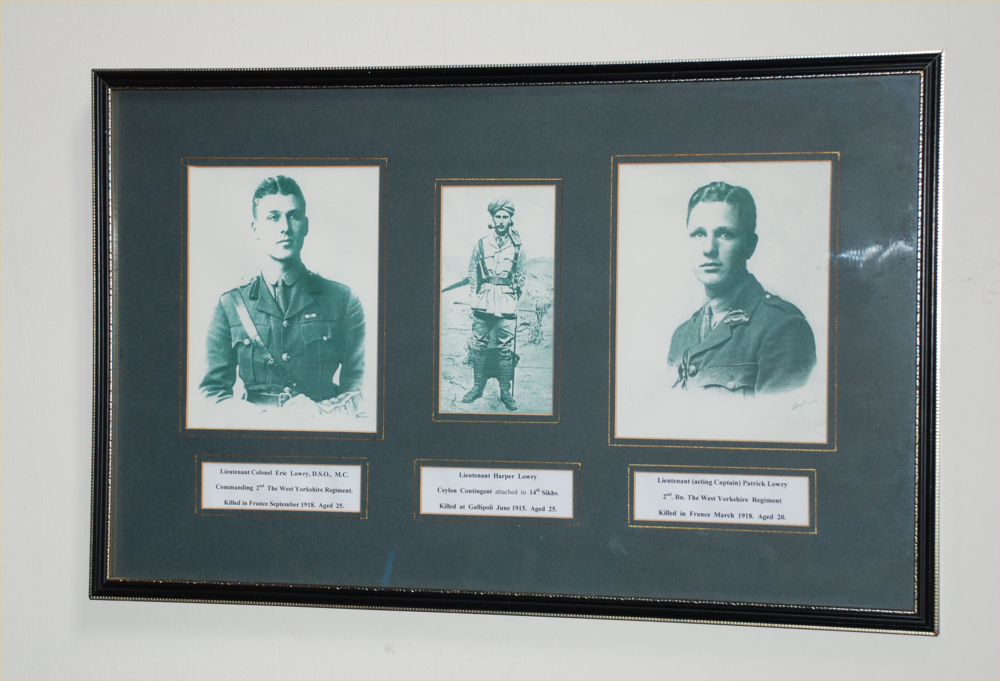 Three framed photos on wall in St Faiths Church, inscription under each.