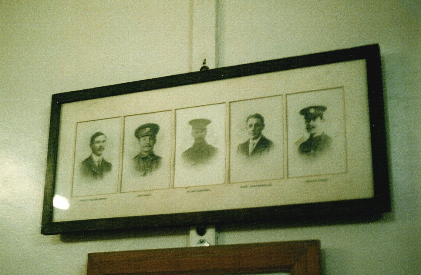 Photos in wooden frame on wall in Memorial Hall