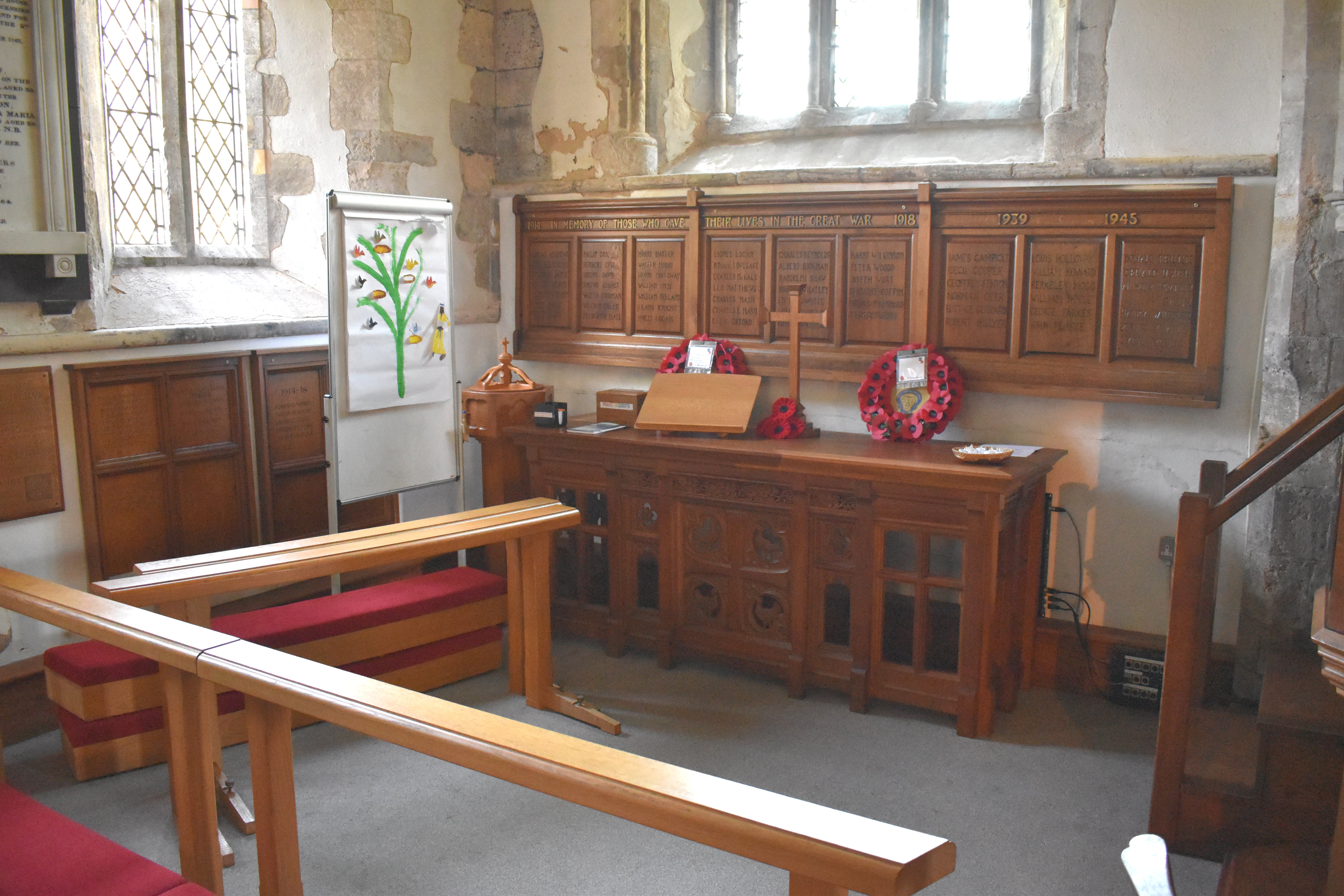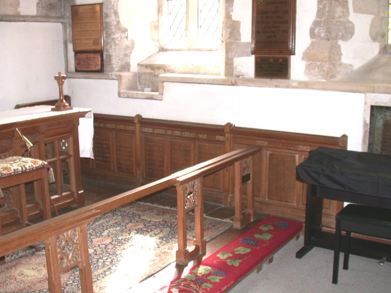 Wooden panelling on wall by side of altar in All Saints Church, names in each panel (Moved around by 2021 - see photo).