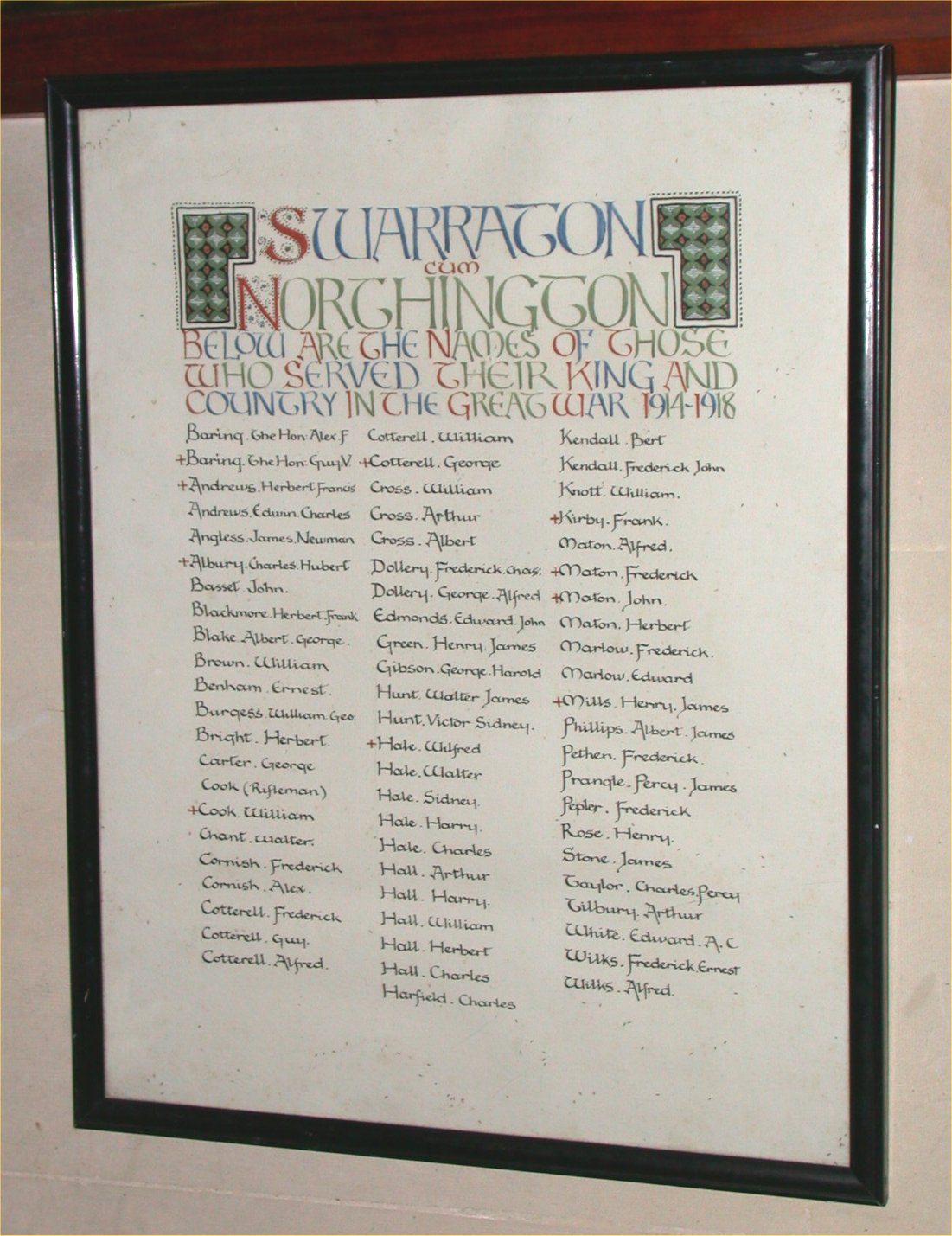 Framed and glazed list on wall in church.