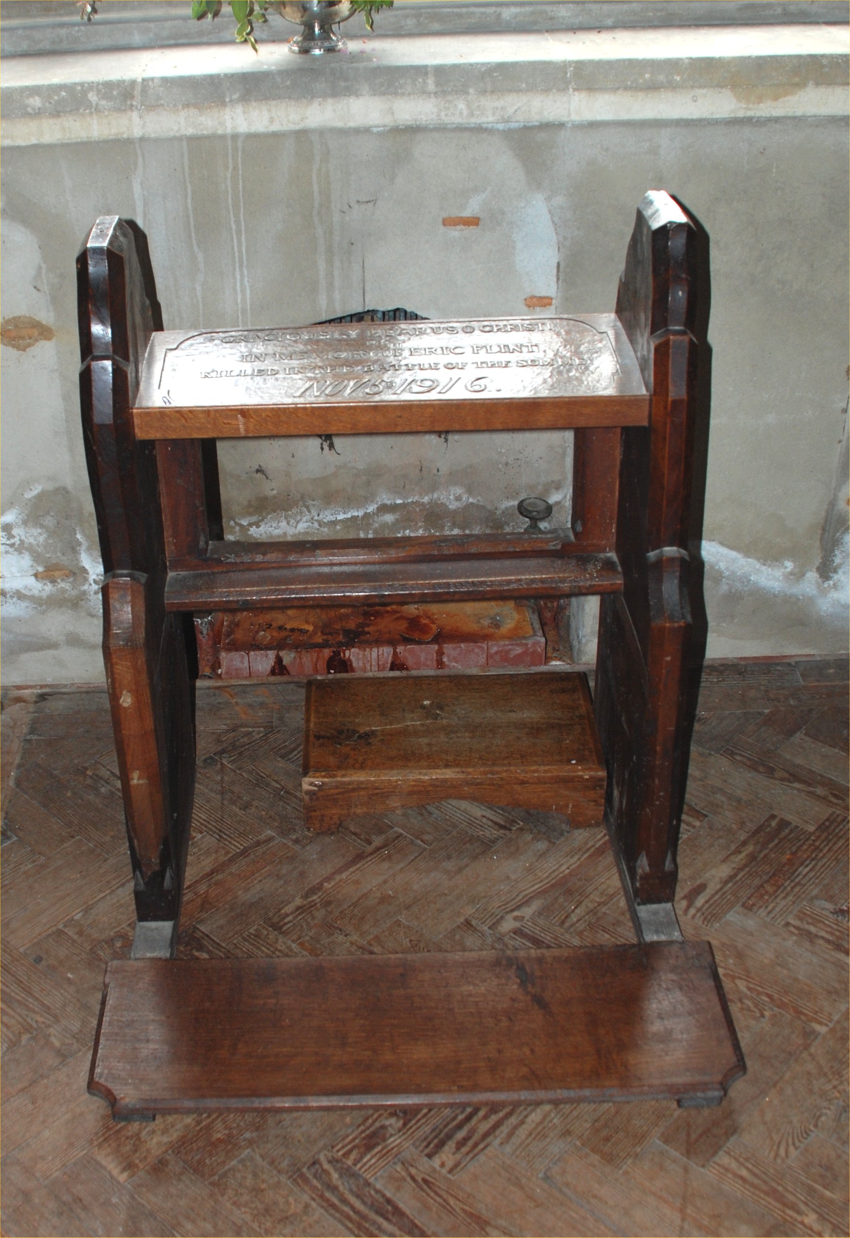 Priests wooden kneeler/table, inscription on top of table.