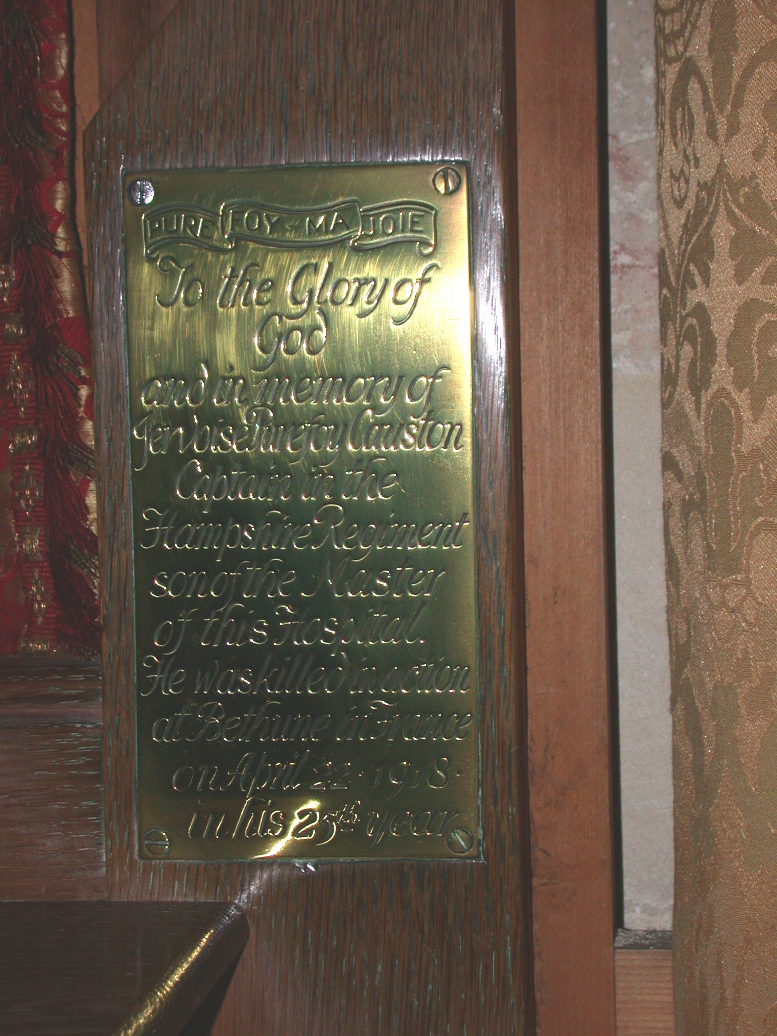 Brass plaque on upright on back of altar in side chapel.
