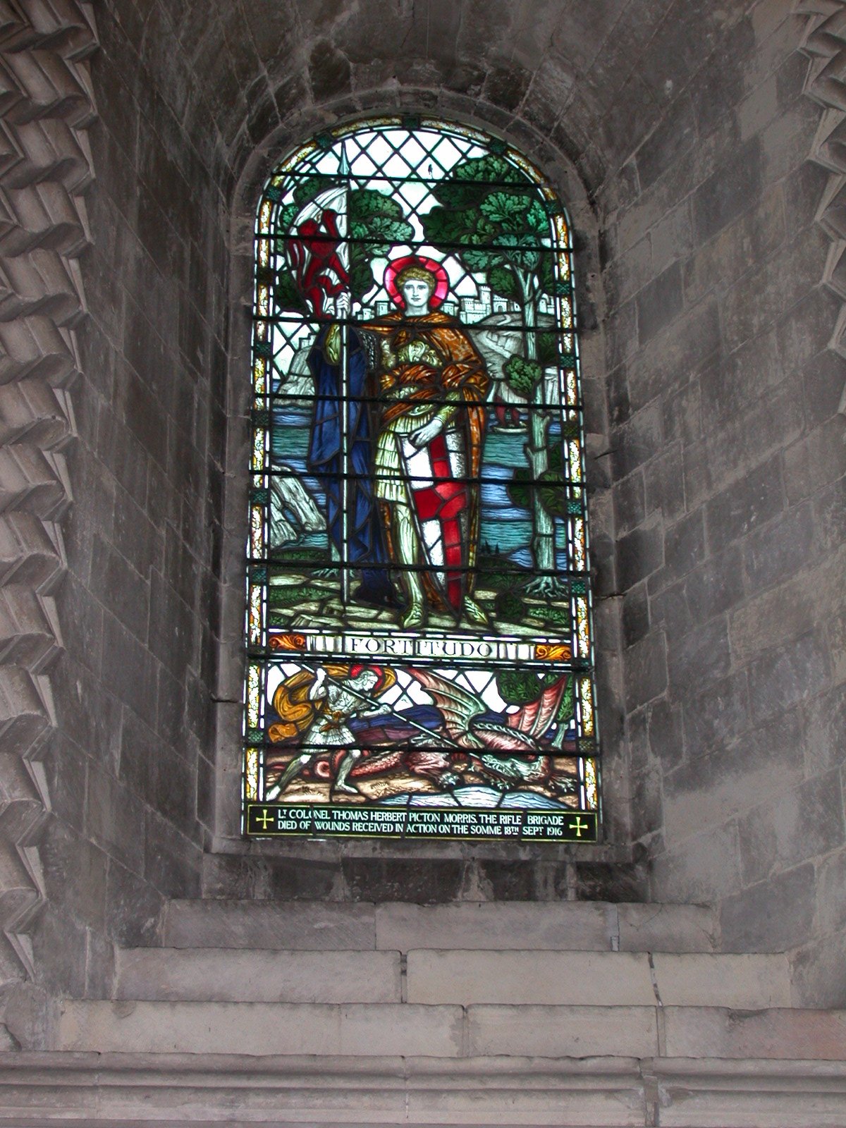 Window above war memorial.