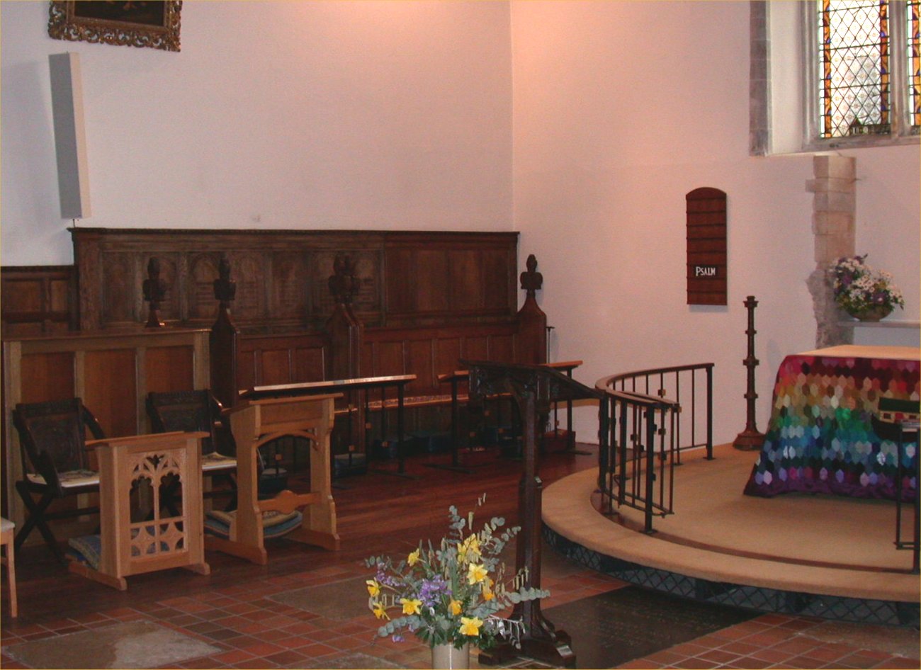 Wooden screens on side walls either side of altar in church