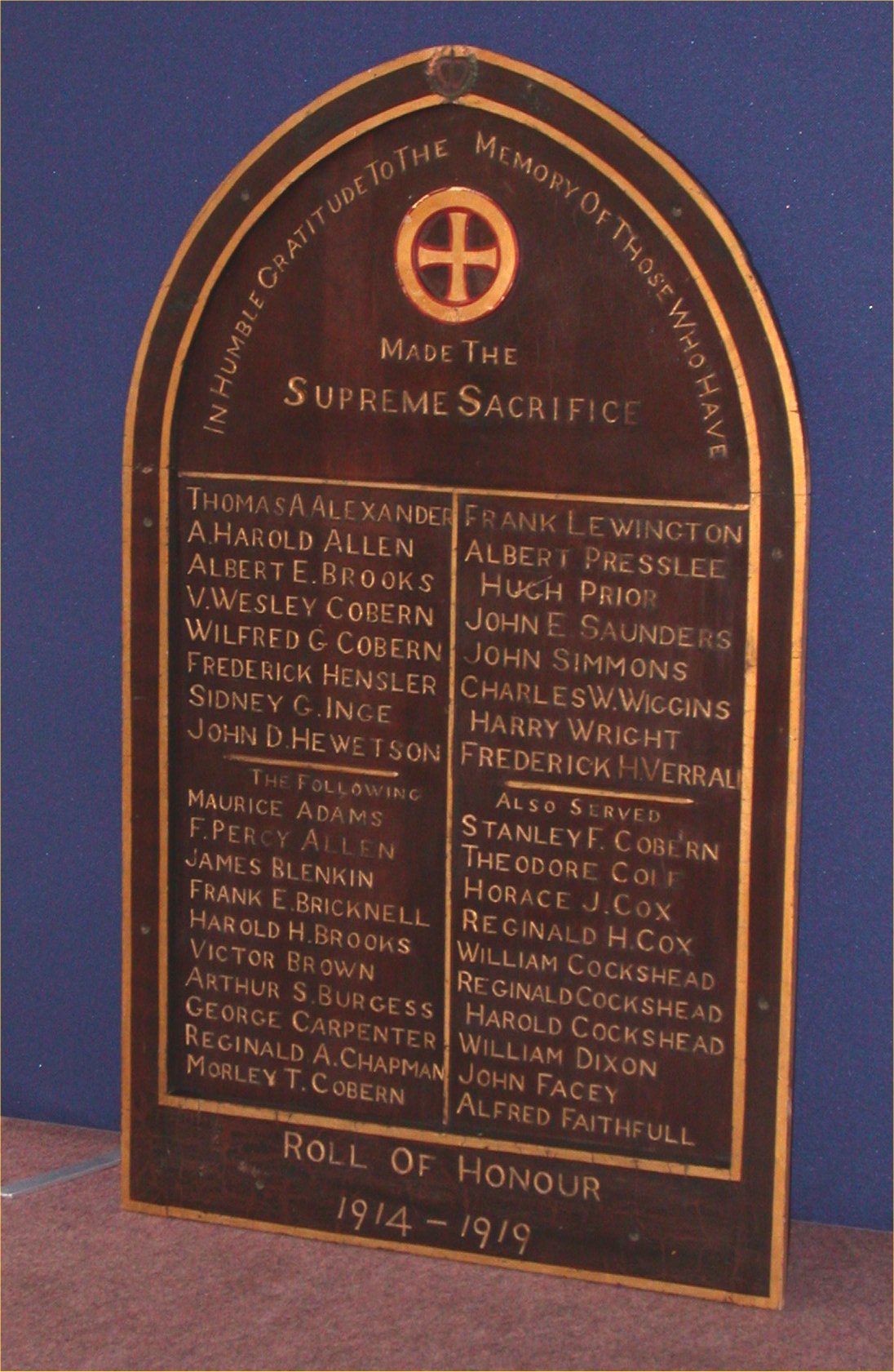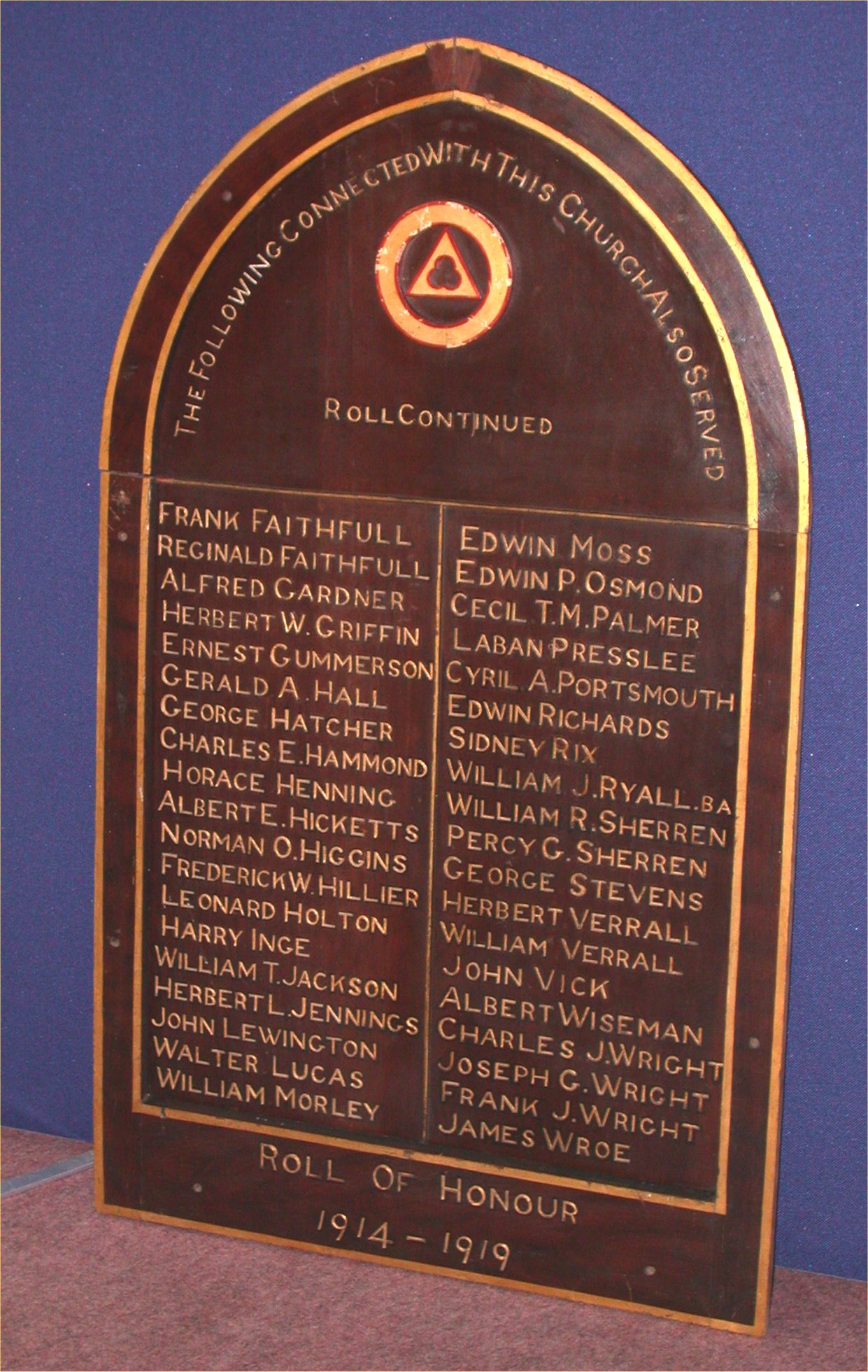 Wooden plaque now in cupboard in United Reform Church. (Also picture in memorial book see Winchester - United Reform Church)