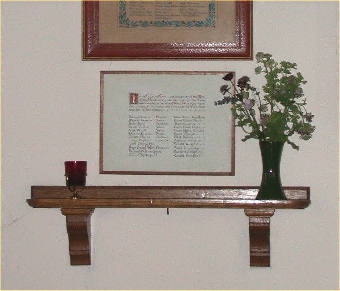 Framed scroll on wall in church under Great War Memorial scroll.