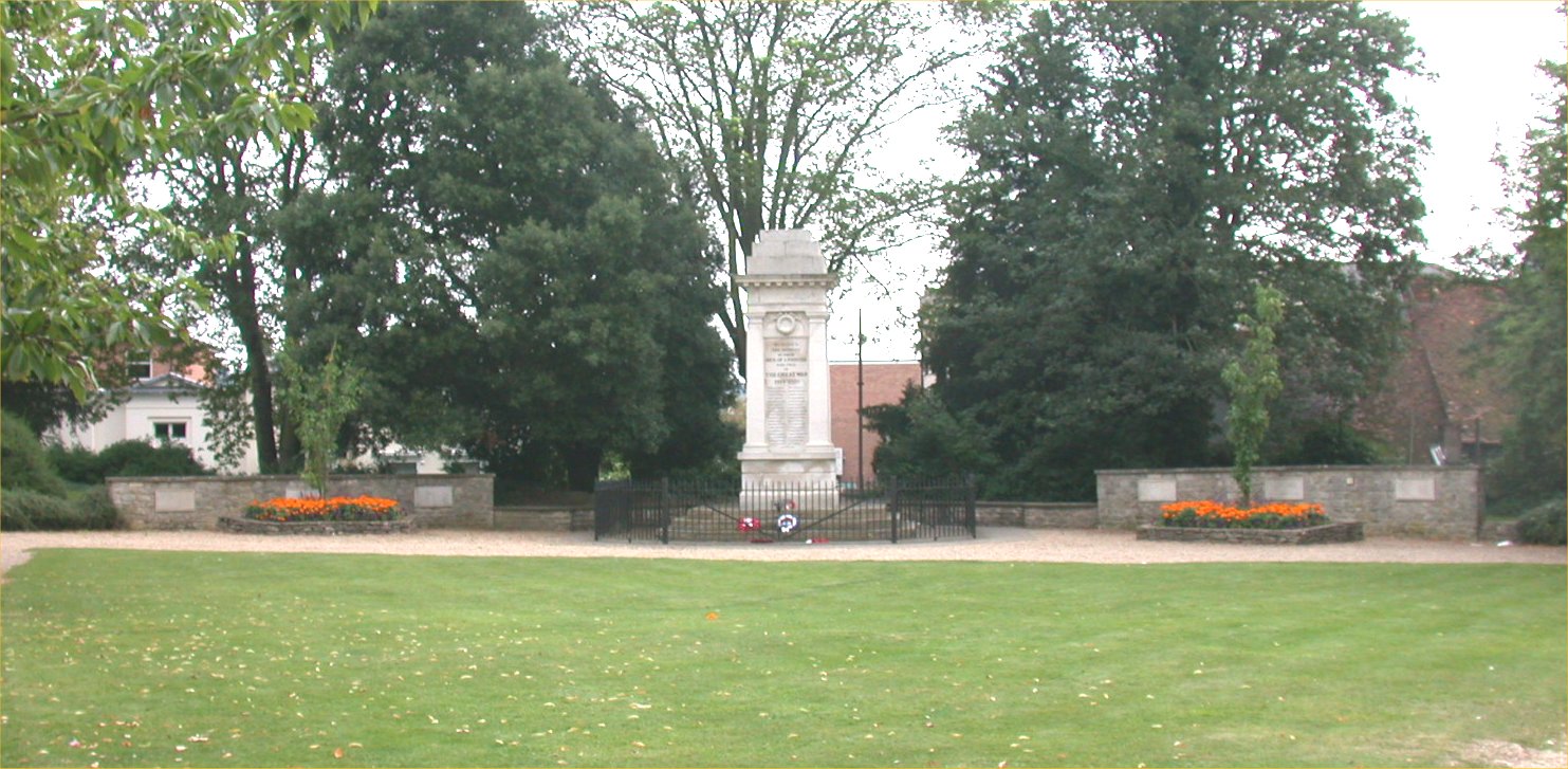 Stone plaques on walls each side of Great War memorial in garden of remembrance by church.