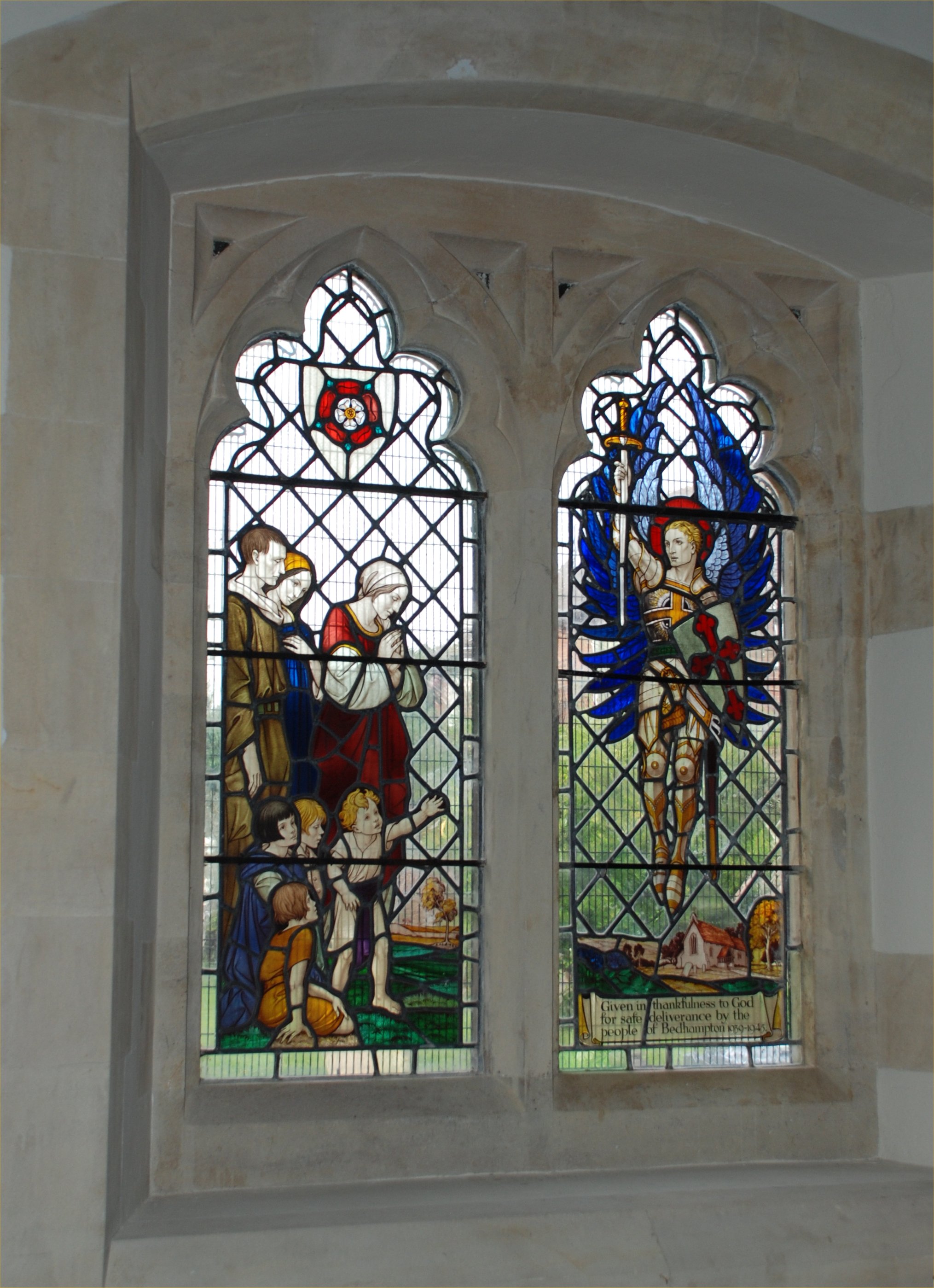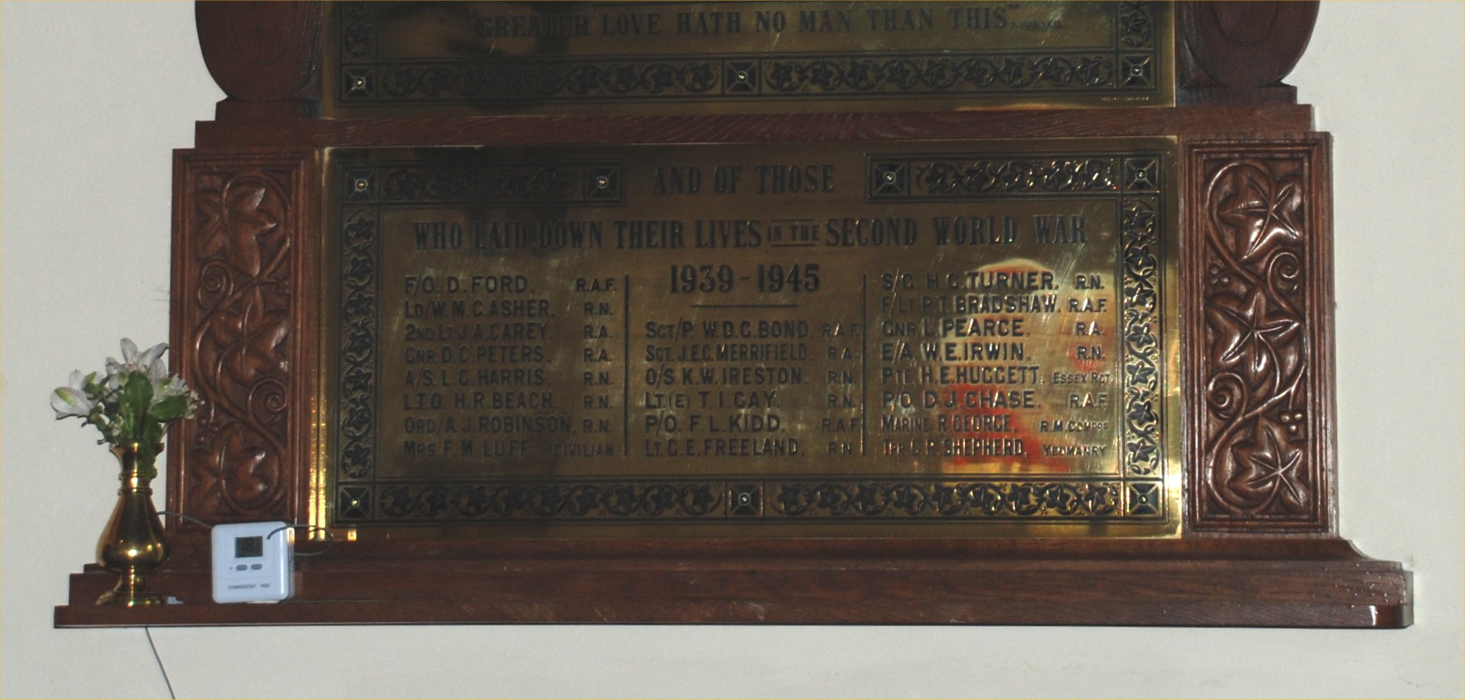 Brass plaque on wooden backing on wall under Great War Memorial in St Thomas a Beckett Church.