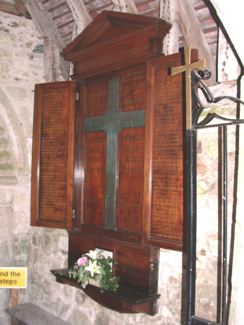 In church porch wooden board on wall, WW2 names added under Great War names.