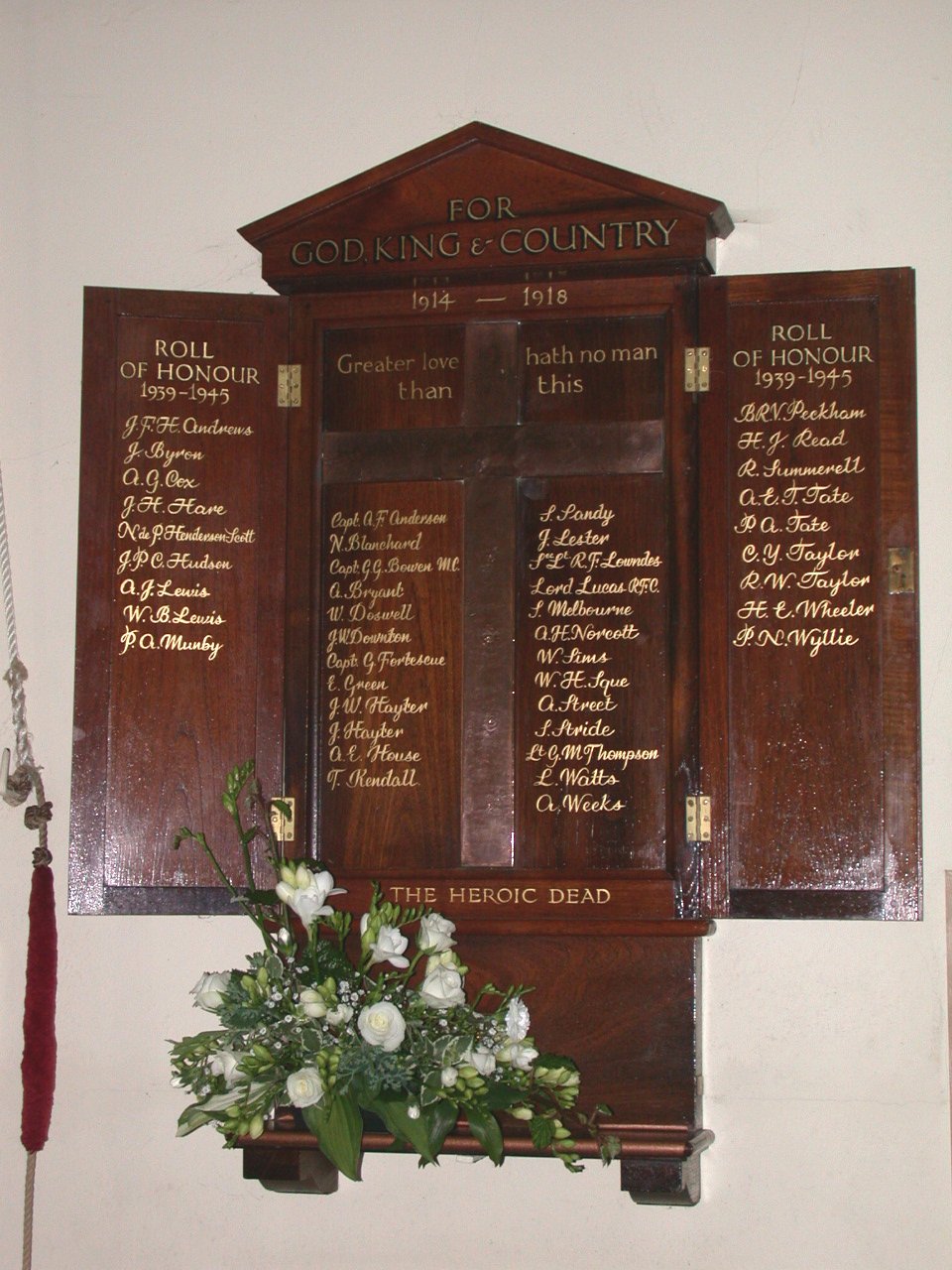Wooden shrine on wall in St John the Baptist Church, WW2 names added on doors each side.