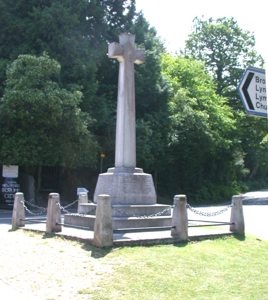 Stone cross on grass triangle on road junction in village, names etc on plinth at bottom of cross. WW2 added to back panel.