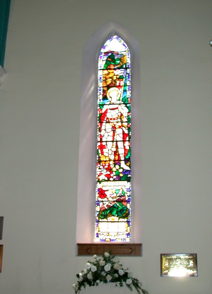 Window in St John the Baptist Church, inscription in bottom panel of window.