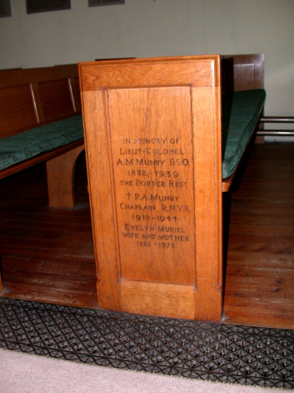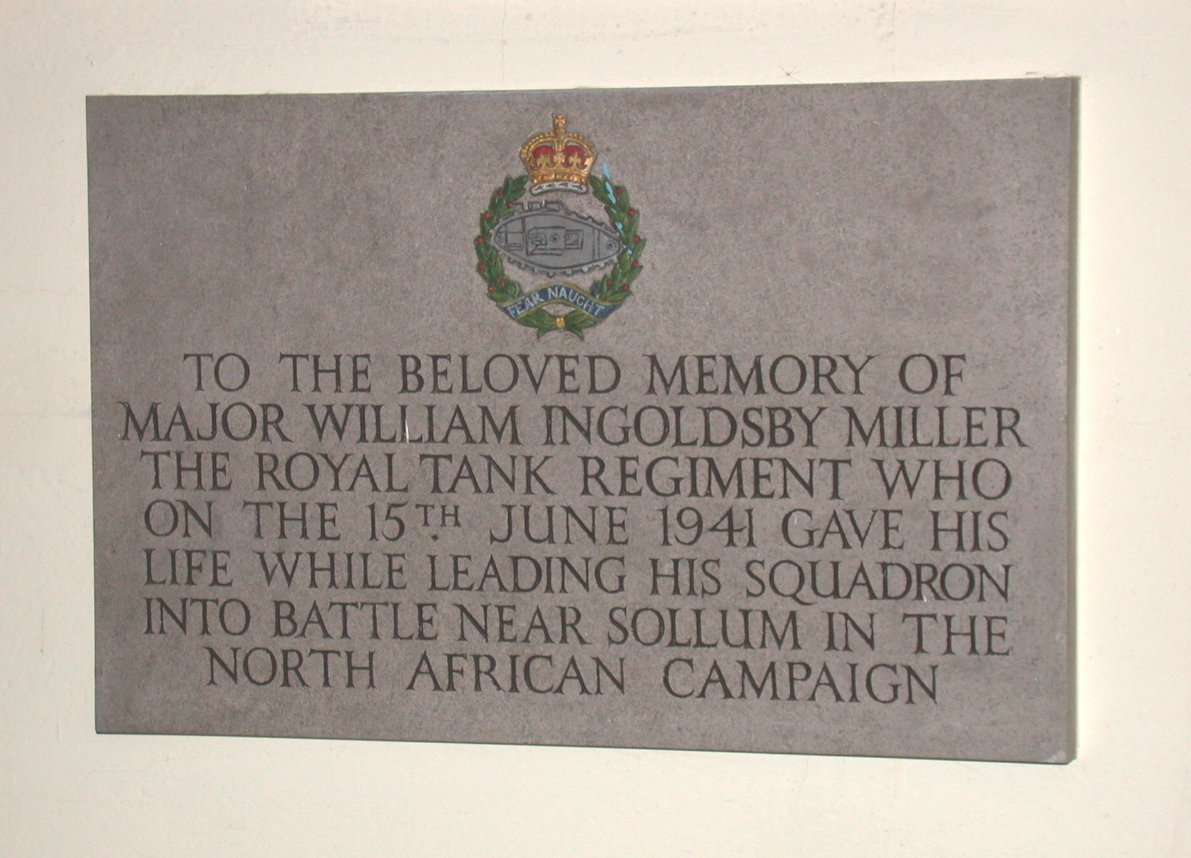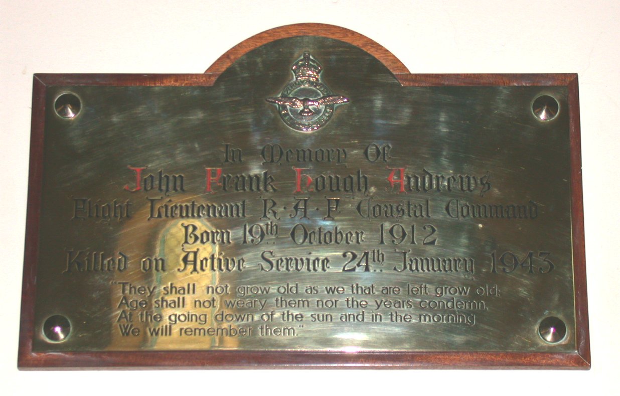 Brass plaque on wooden backing on wall in St John the Baptist Church.