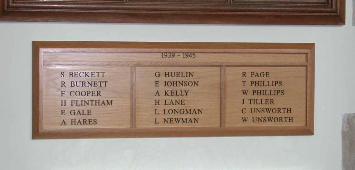 Wooden tablet on wall in St Boniface Church under Great War memorial.