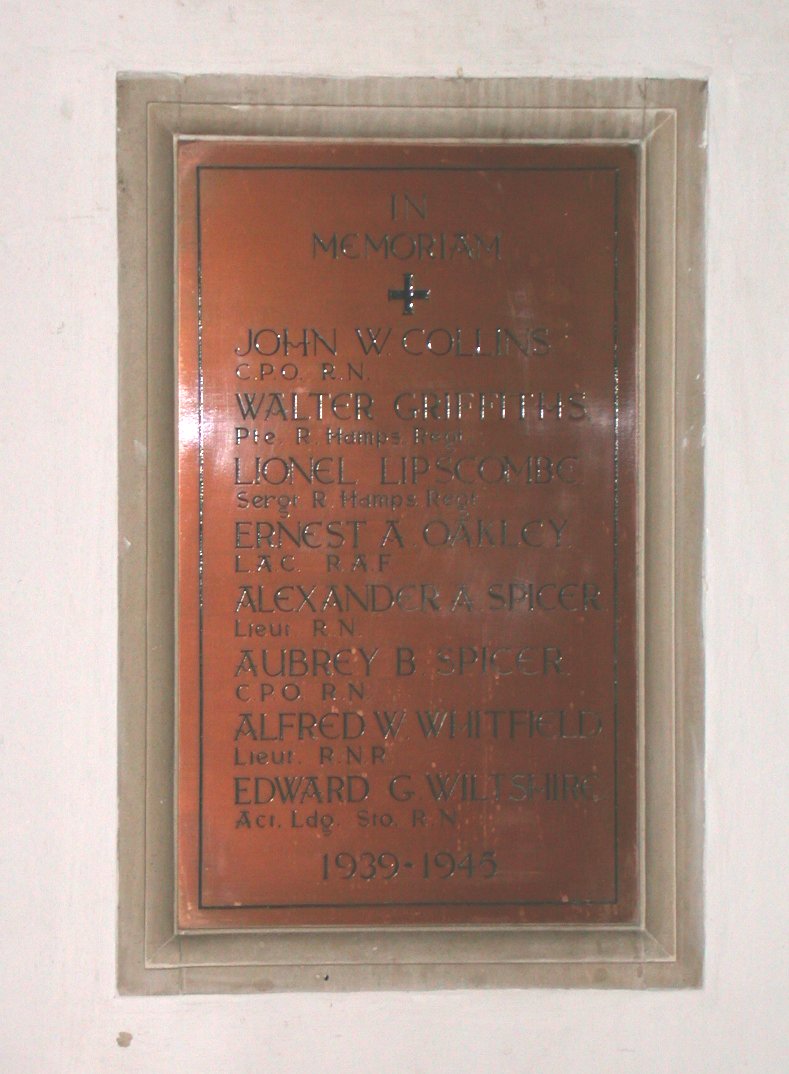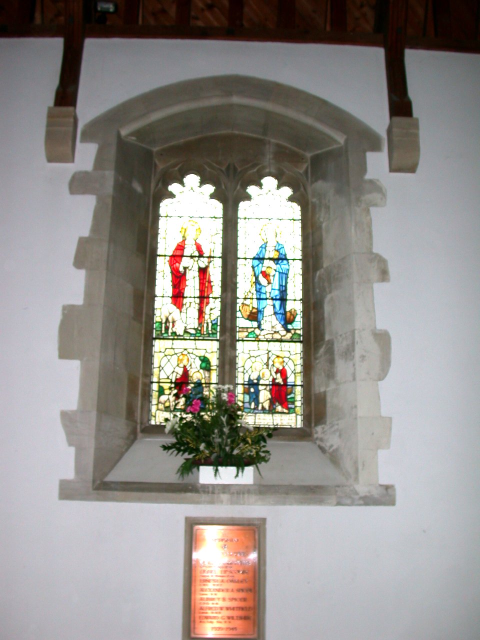 Window above War Memorial in St Peter's Church, inscriptions at bottom of each panel.