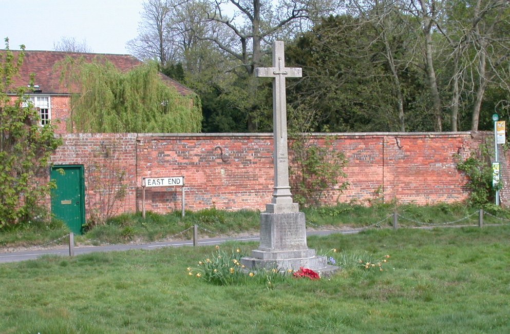 Stone cross on green triangle in village, names are East Woodhay people and are on the sides of the top square plinth base.