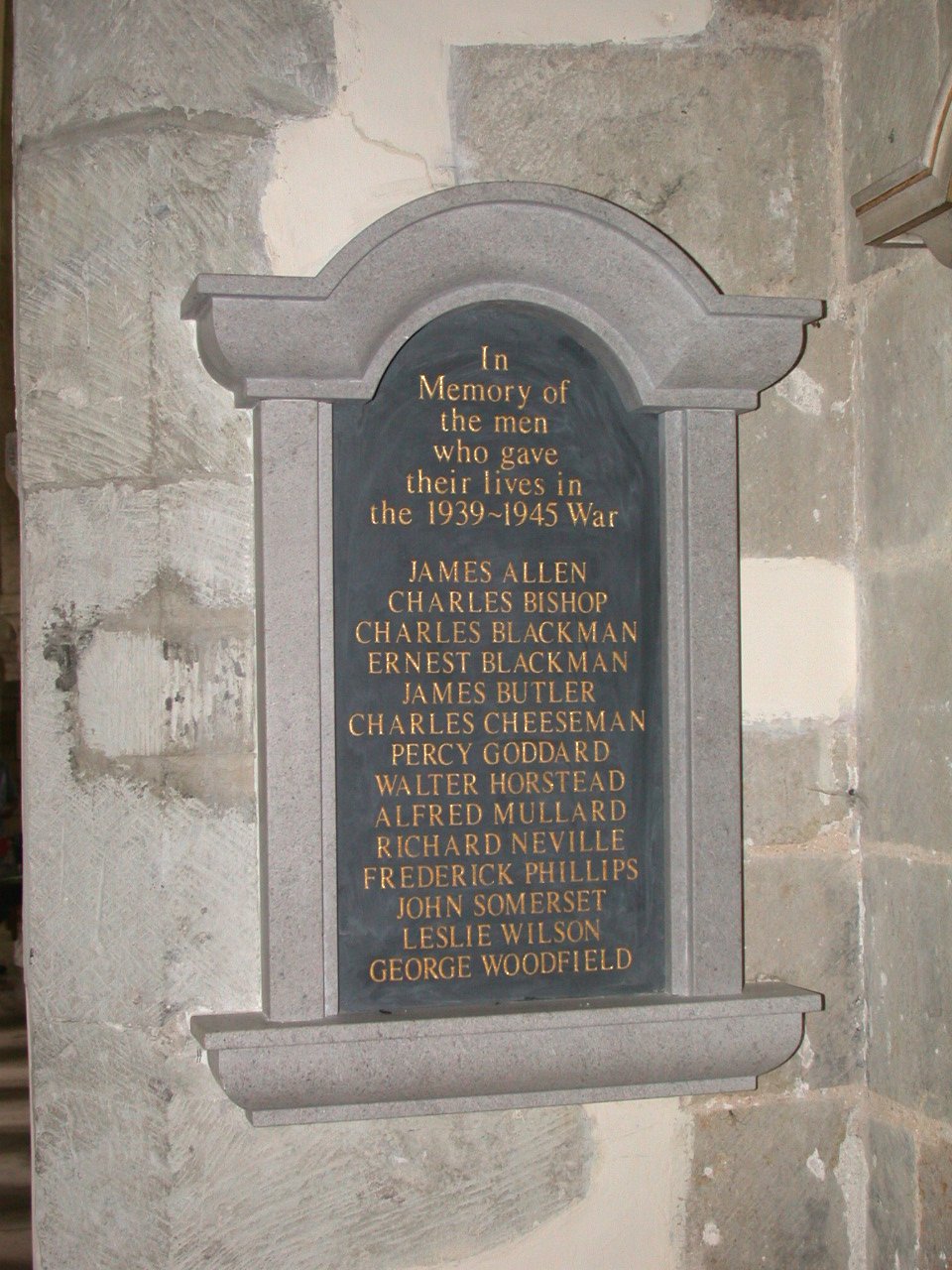 Stone cross on roadside in village, names added on bronze plaque on right side at bottom.