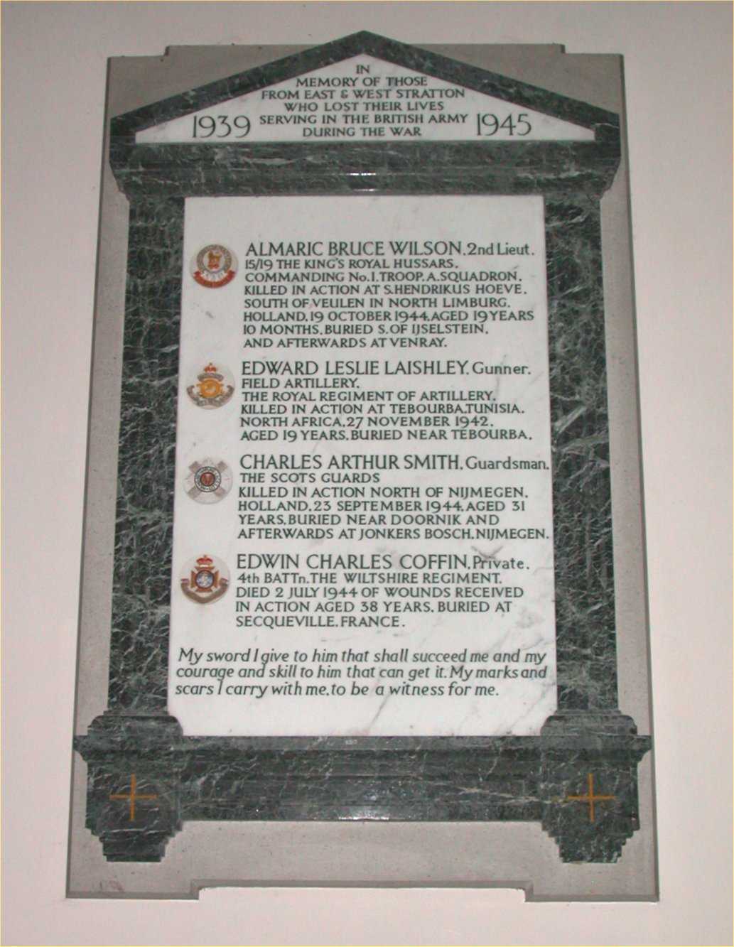 ALMARIC BRUCE WILSON, 2nd Lieut. 15/19 The King's Royal Hussars, Commanding No,1 Troop. A. Squadron, killed in action at S.Hendrikus Hoeve, south of Veulen in North Limburg, Holland, 19 October 1944. Aged 19 years 10 month. Buried S. of Ijselstein, and afterwards at Venray. EDWARD LESLIE LAISHLEY, Gunner, Field Artillery, The Royal Regiment of Artillery, killed in action at Tebourba, Tunisia, North Africa, 27 November 1942. Aged 19 years. Buried near Tebourba. CHARLES ARTHUR SMITH, Guardsman, The Scots Guards killed in action north of Nijmegen, Holland, 23 September 1944. Aged 31 years. Buried near Doornik and afterwards at Jonkers Bosch, Nijmegan. EDWIN CHARLES COFFIN, Private, 4th Battn. The Wiltshire Regiment, died 2 July 1944 of wounds received in action aged 38 years. Buried at Secqueville, France. |