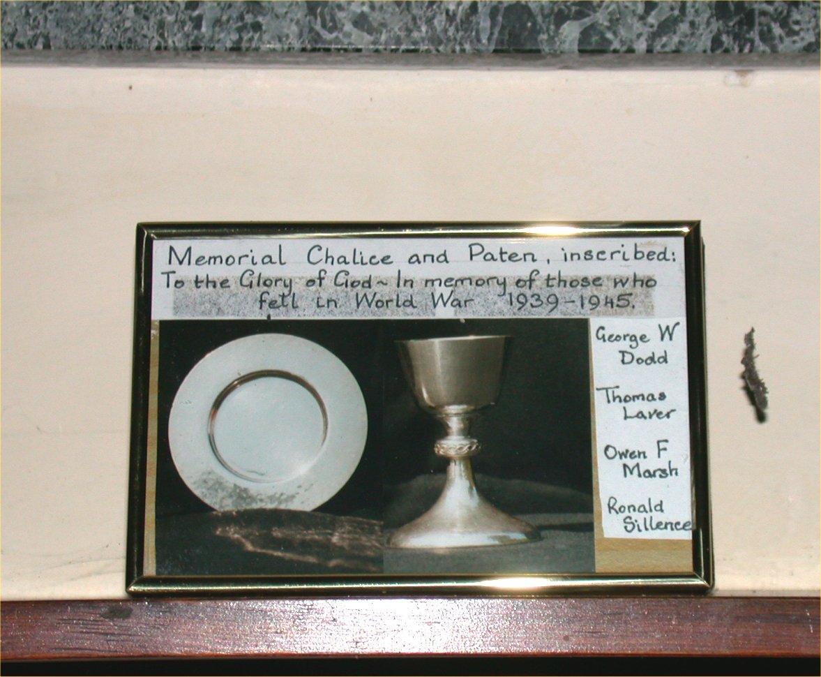 Small framed picture & hand written roll on shelf under Great War memorial in St Peter's Church.