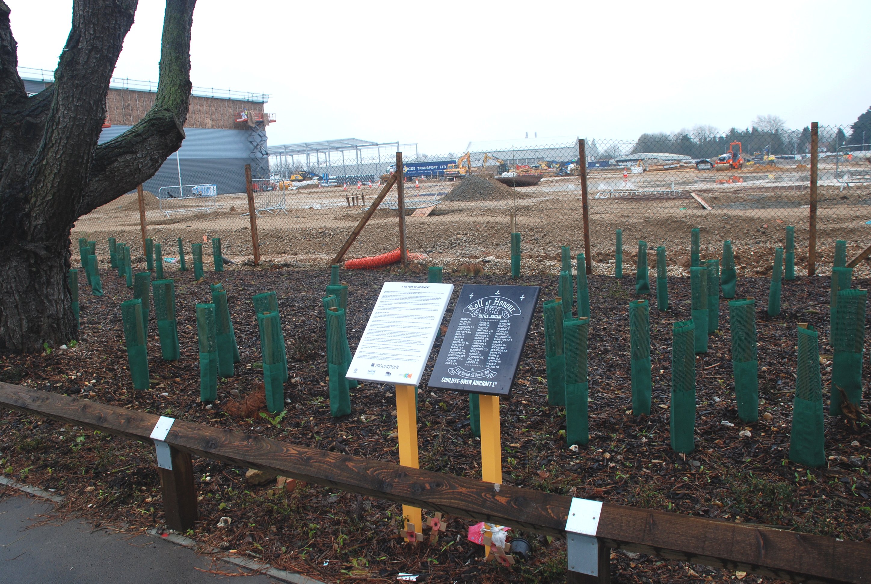 New board placed by road where factory was as redevelopment has taken place 2018. Naming idential to above