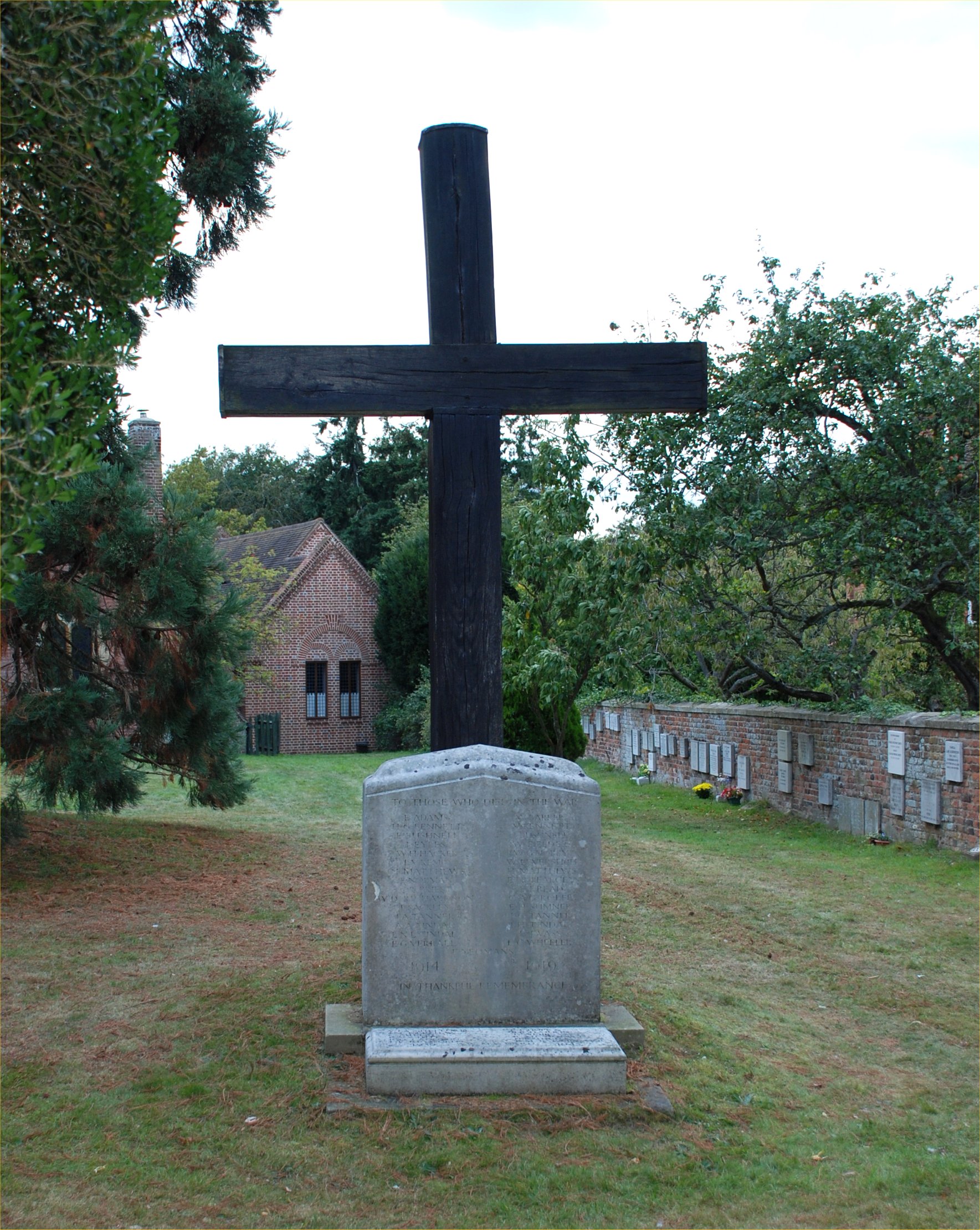 Wooden cross behind stone plinth, WW2 names on plaque on ground in front of plinth.