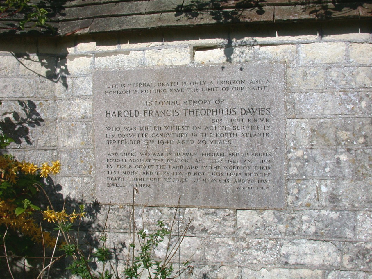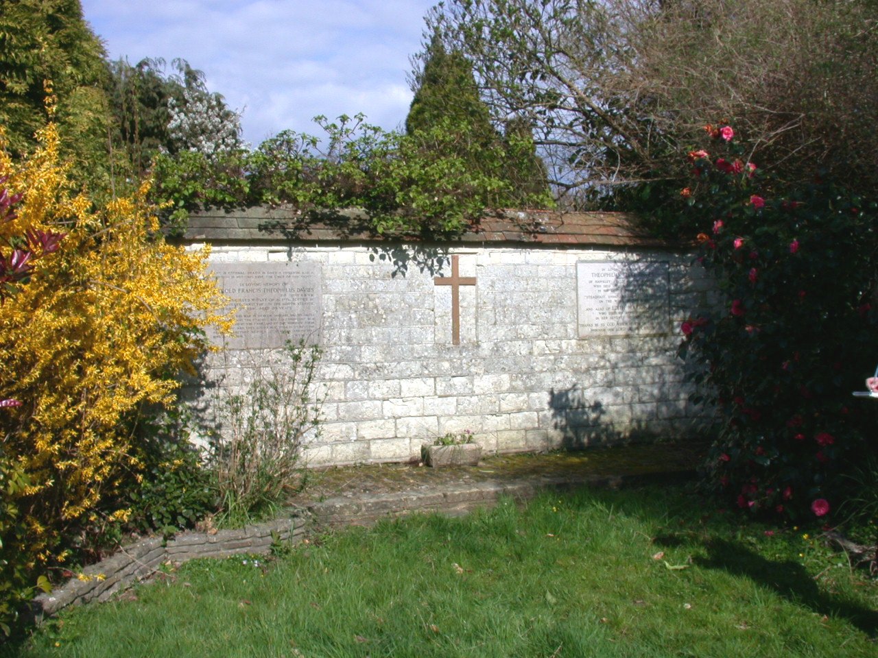 Private shrine to Davies family in churchyard, stone tablet on wall.
