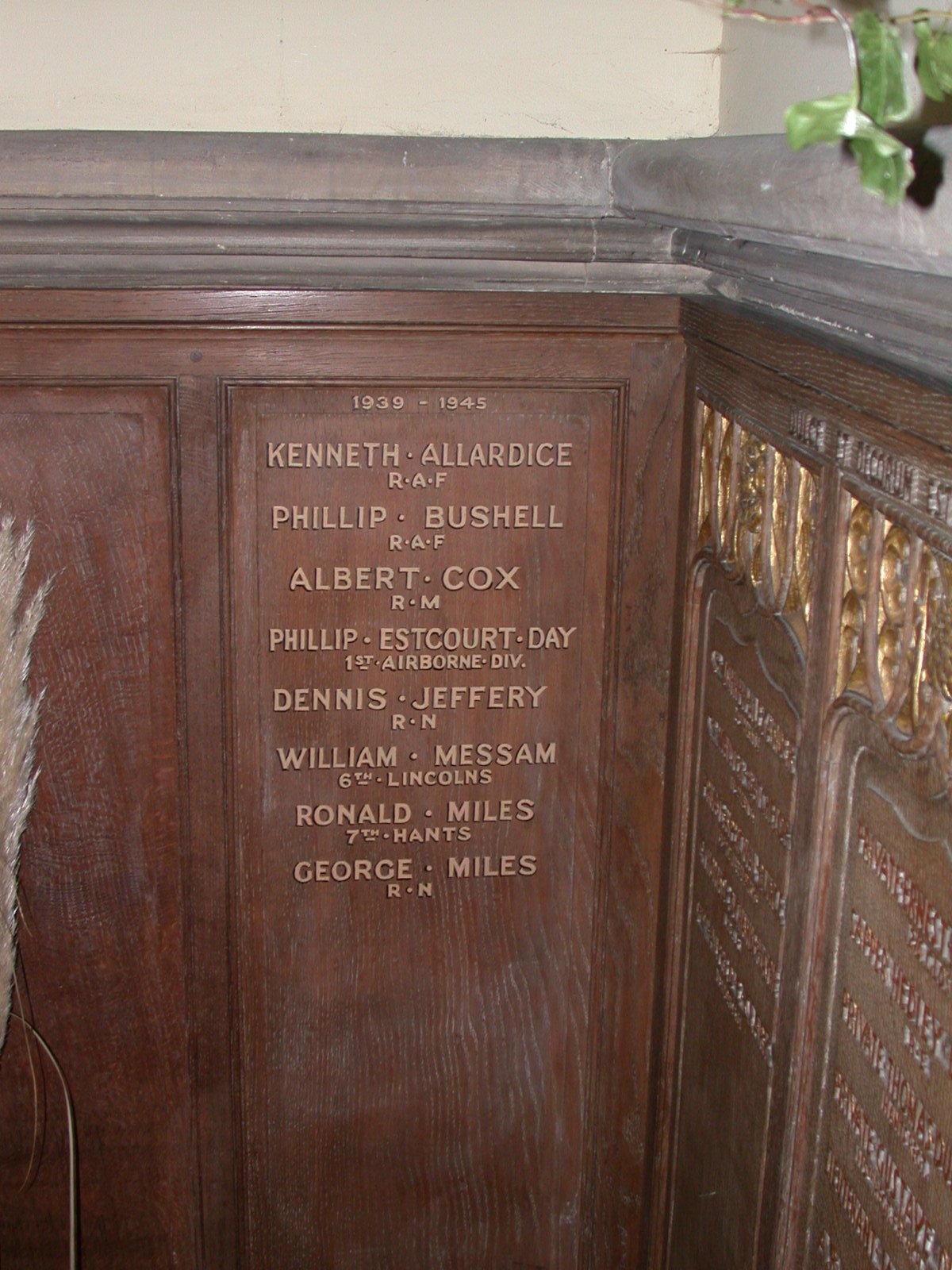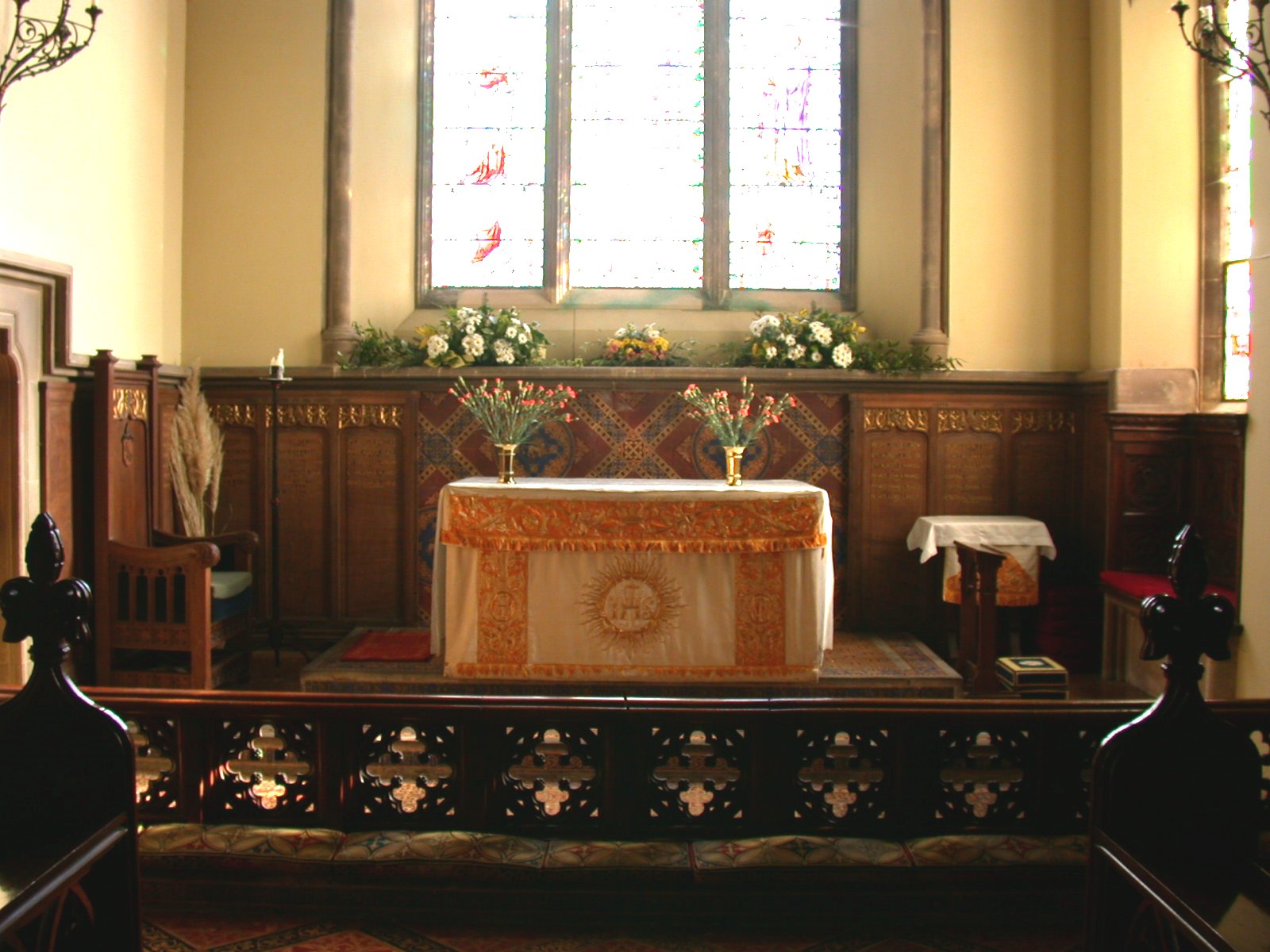 Wooden panel on wall in All Saints Church near altar.