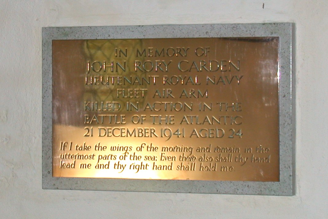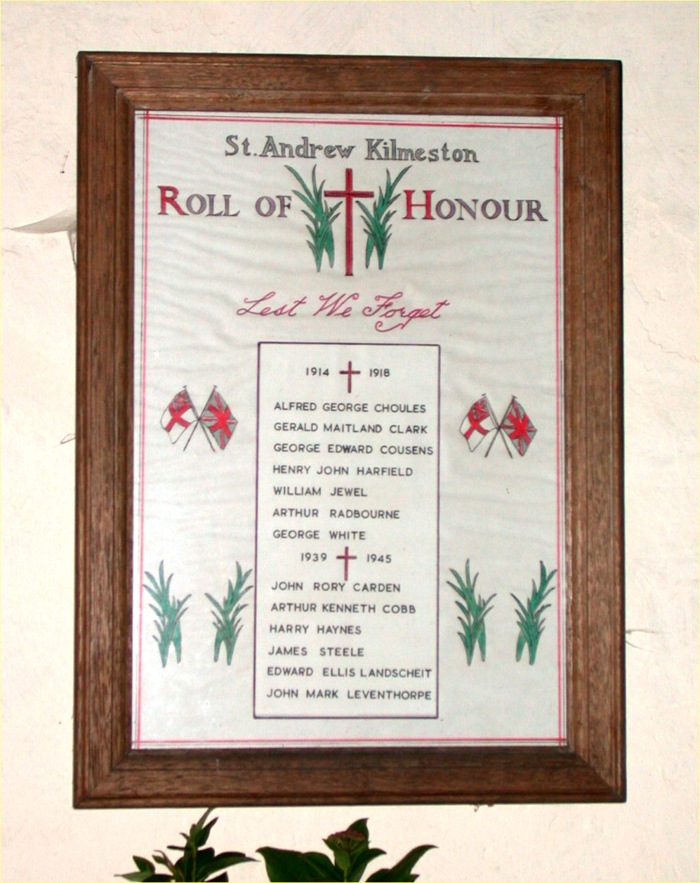 Roll of Honour for both wars in wooden frame on wall in church of St Andrew.
