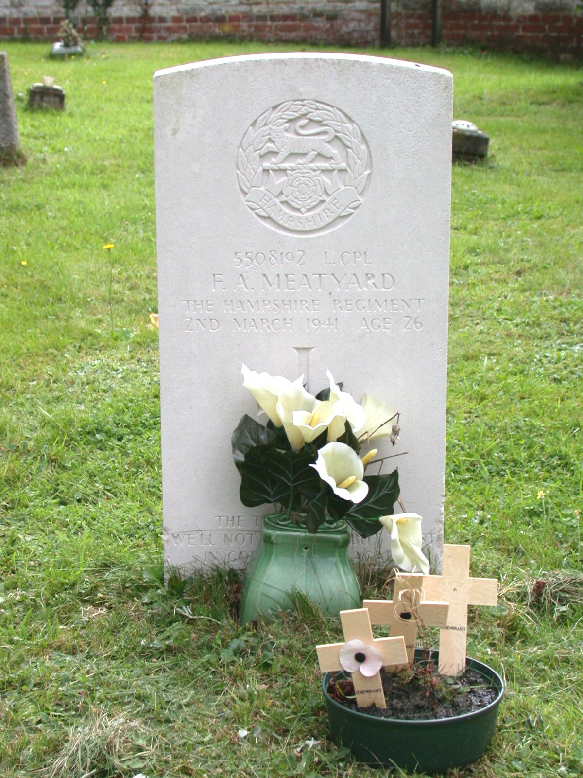 5508192 L.Cpl. F.A. Meatyard The Hampshire Regiment 2nd March 1941 Age 26 The trial was hard We'll not complain, but trust in God to meet again the One we love so dear