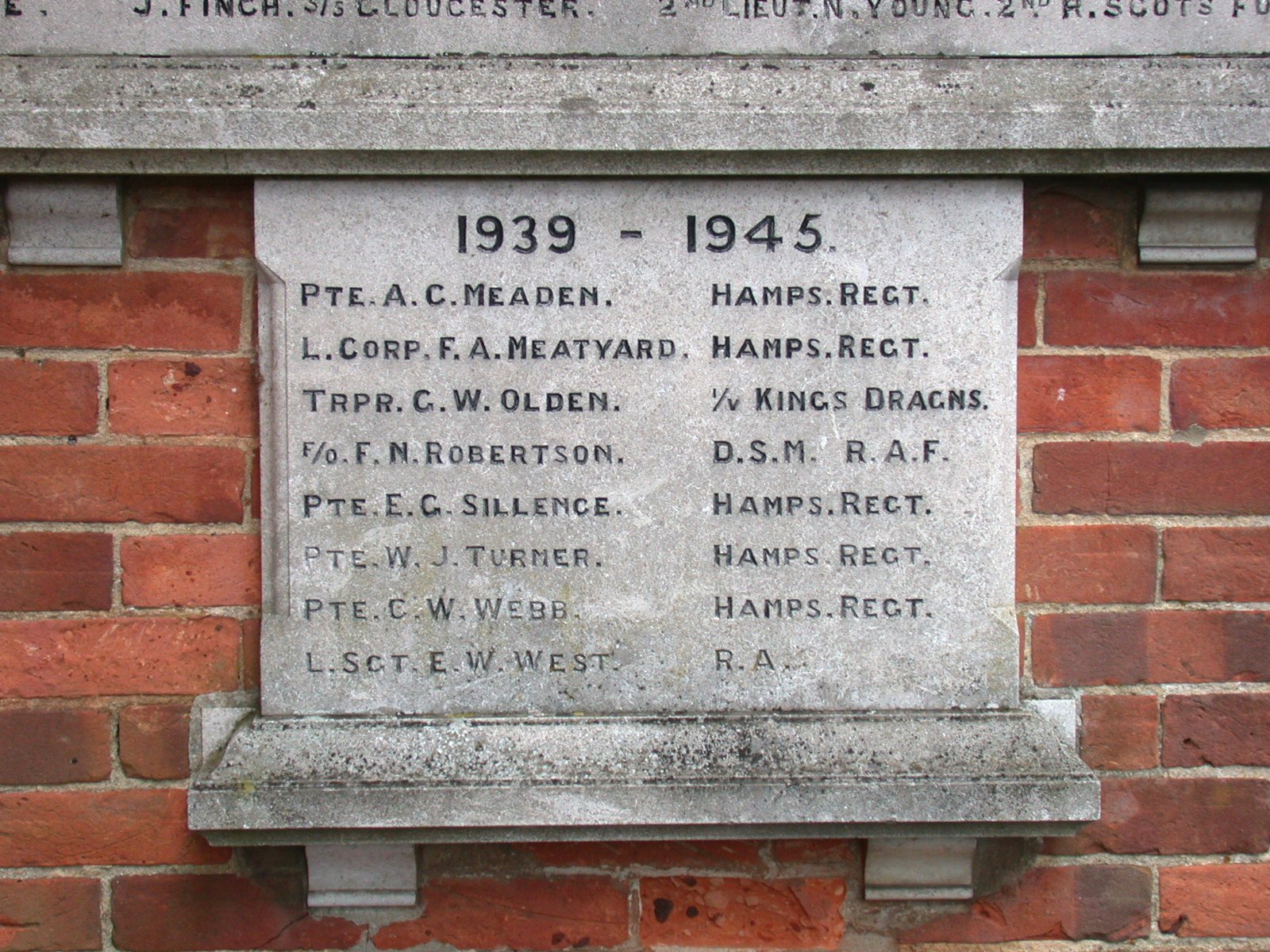 Pte. A.C. Meaden. Hamps.Regt. L.Corp. F.A. Meatyard. Hamps.Regt. Trpr. G.W. Olden. 1/V Kings Dragns. F/O. F.N. Robertson. D.S.M. R.A.F. Pte. E.G. Sillence. Hamps.Regt. Pte. W.J. Turmer. Hamps.Regt. Pte. C.W. Webb. Hamps.Regt. L.Sgt. E.W. West. R.A.